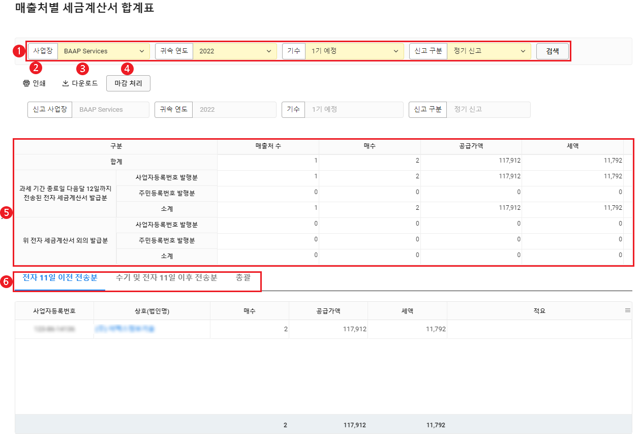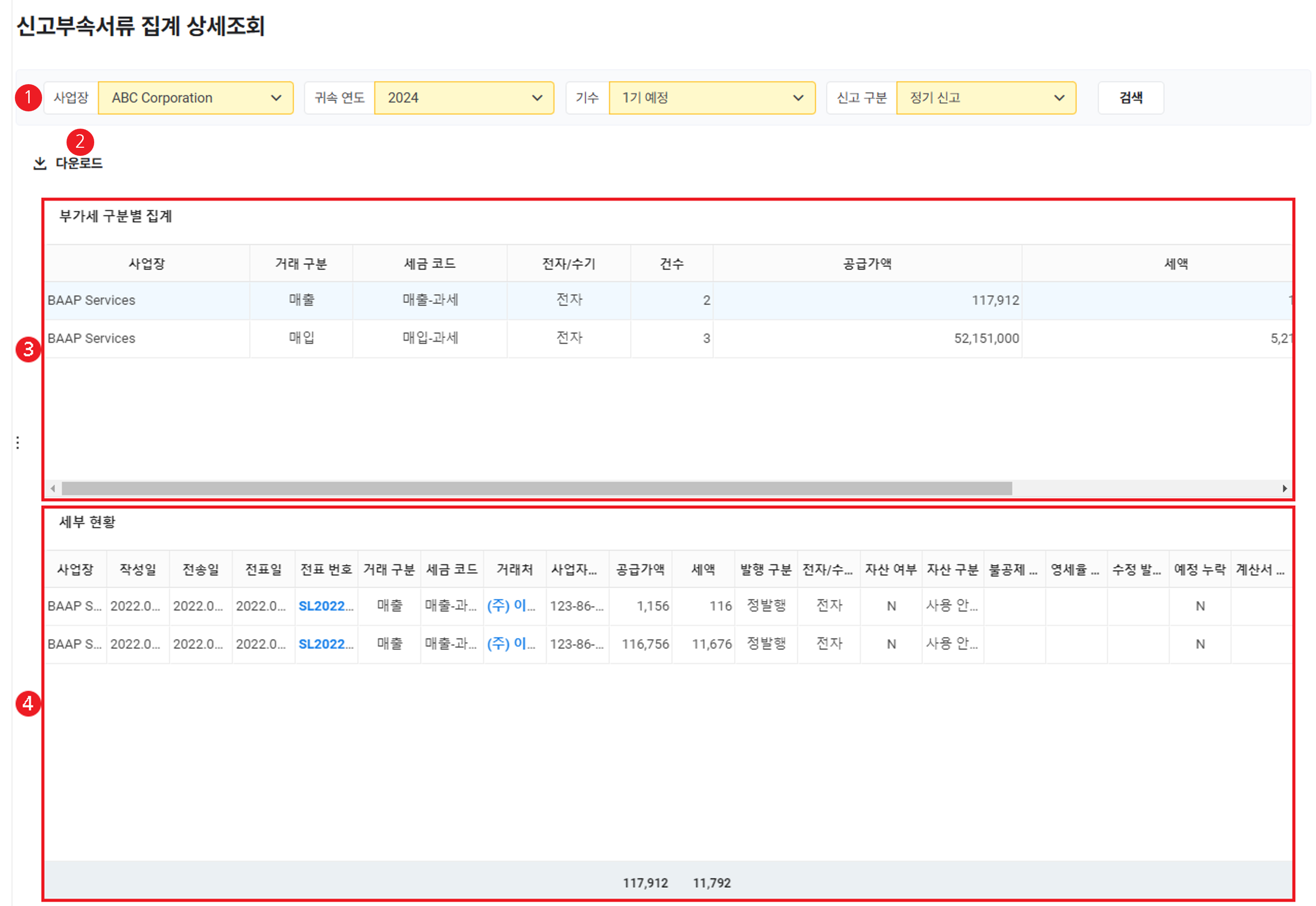 | ④ 세부 현황 | 사업장, 거래 구분, 세금 코드, 전자/수기의 구분이 동일한 데이터를 통합한 상세 내역 확인 각 상세 정보를 클릭하여 정보 조회 가능