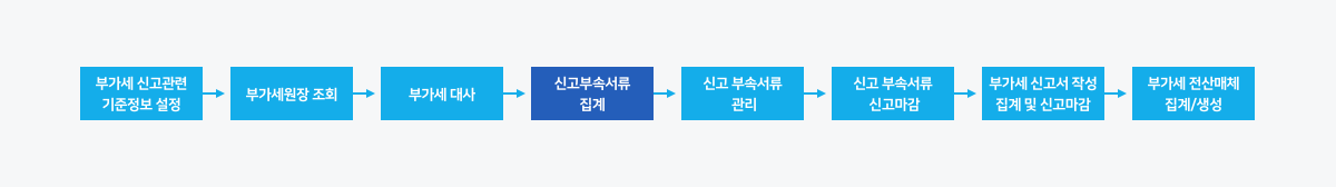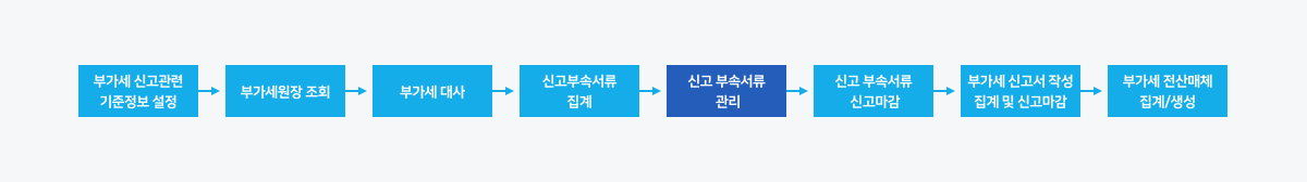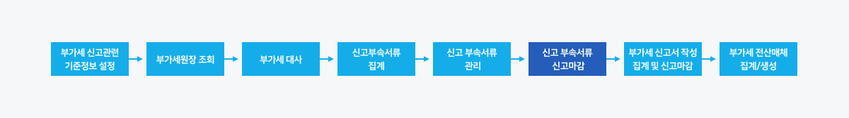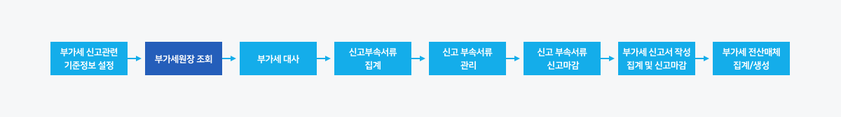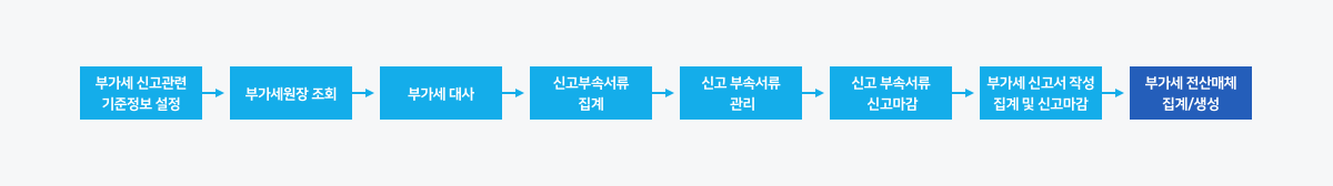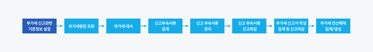 부가세 신고에서는 전표 생성 시 입력한 부가세 대급금, 예수금 정보를 기준으로 부가세 신고서 및 부속서류를 사업장별로 작성하고, 신고용 전산매체를 생성하여 부가세 신고를 진행할 수 있습니다.