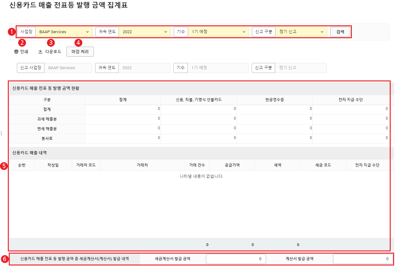 신고 부속서류를 통해 집계된 데이터를 다양한 조건으로 검색하여 조회하고, 부가세 신고가 마감된 기수의 데이터를 전산 매체로 생성할 수 있습니다.