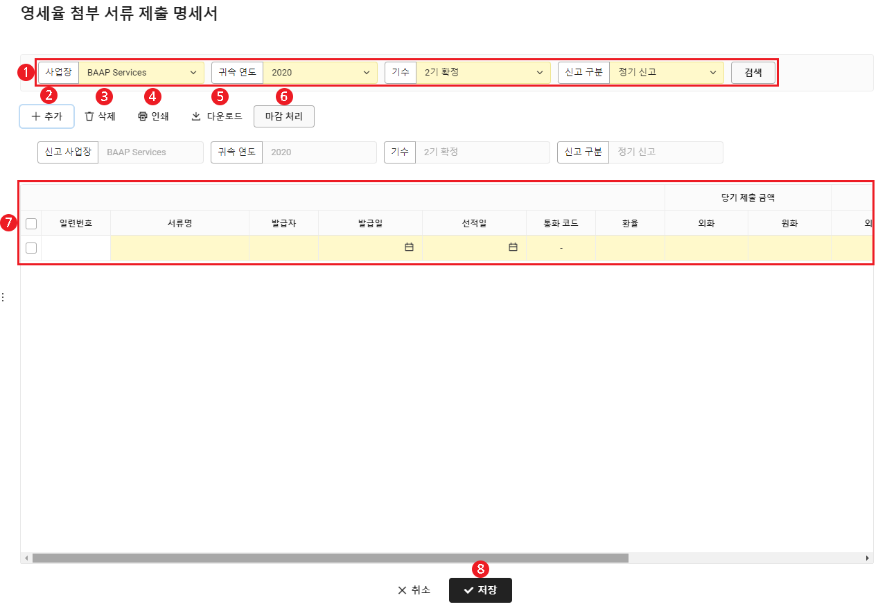 | ① 검색창 | 집계 대상 서류를 사업장, 귀속 연도, 기수, 신고 구분 조건에 따라 검색 |