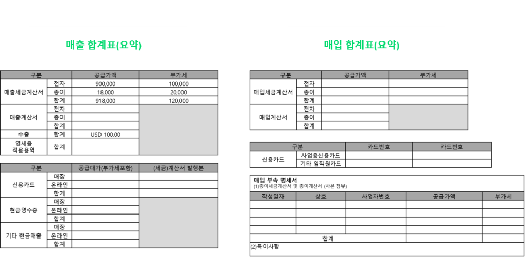국세청 홈택스 홈페이지에 접속하여 전자세금계산서, 현금영수증, 사업용 신용카드 내역을 확인한 후 아래와 같이 매입/매출 합계표로 정리하면 네이버웍스 회계 서비스의 원장과 홈택스의 자료가 일치하는지 쉽게 검증할 수 있습니다. 또한, 작성한 매입/매출 합계표를 부가세 신고 시의 검증 자료로 활용할 수 있습니다.