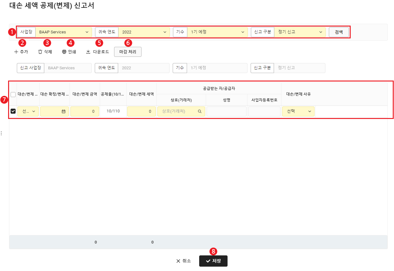 | ⑧ 저장 | 클릭하여 입력한 신고서 내용 저장 |