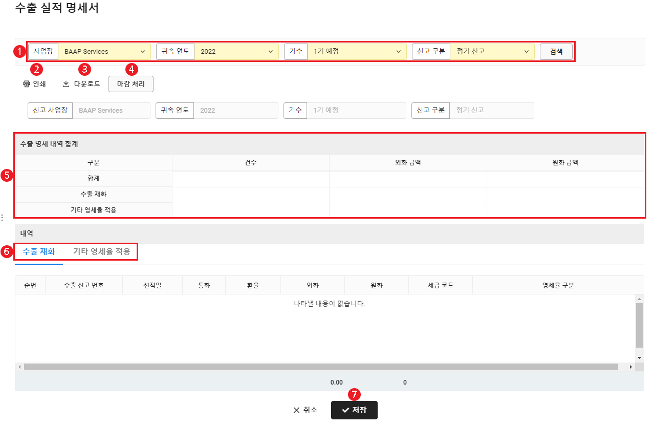 수출 실적 명세서를 작성하고 마감 처리할 수 있습니다.