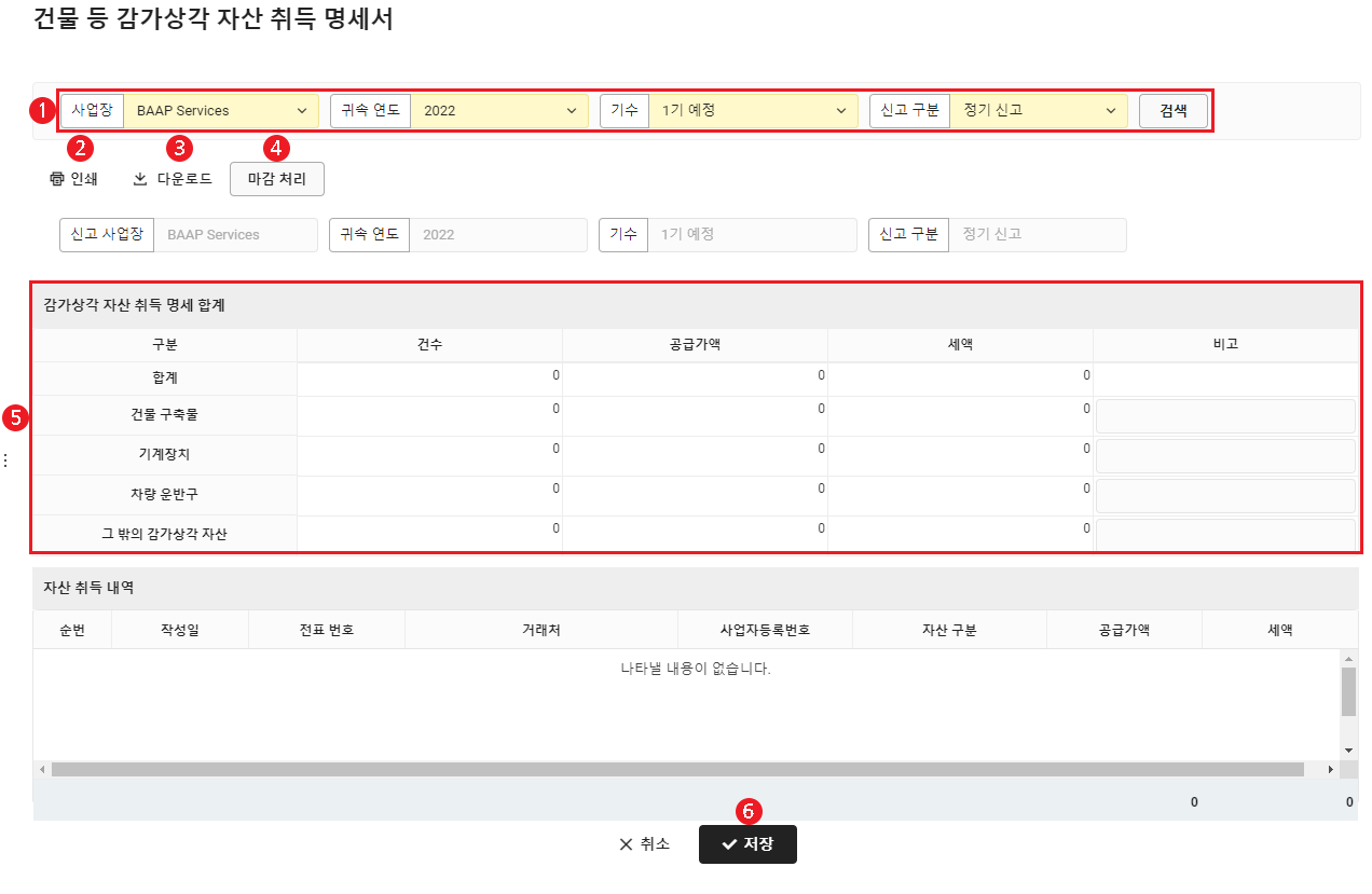 건물 등 감가상각 자산 취득 명세서를 확인하고 비고를 입력한 후 마감 처리할 수 있습니다.