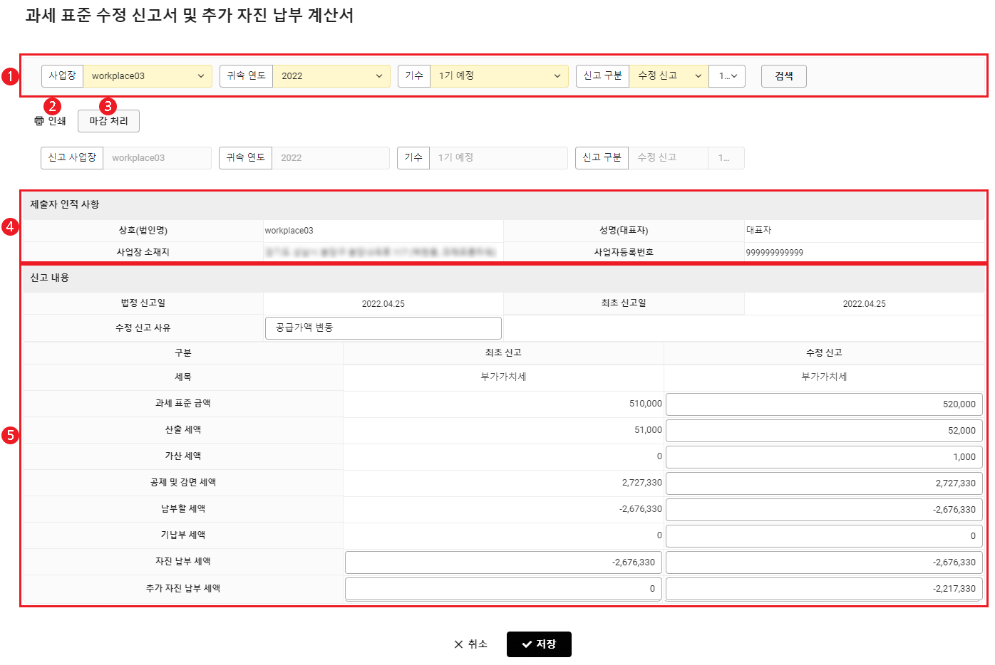 수정 신고용 부속서류는 부가세 신고서의 마감이 완료된 이후에 작성하고 마감할 수 있습니다. 과세 표준 및 세액의 결정(경정) 청구서, 과세 표준 수정 신고서, 추가 자진 납부 계산서가 자동으로 생성됩니다.