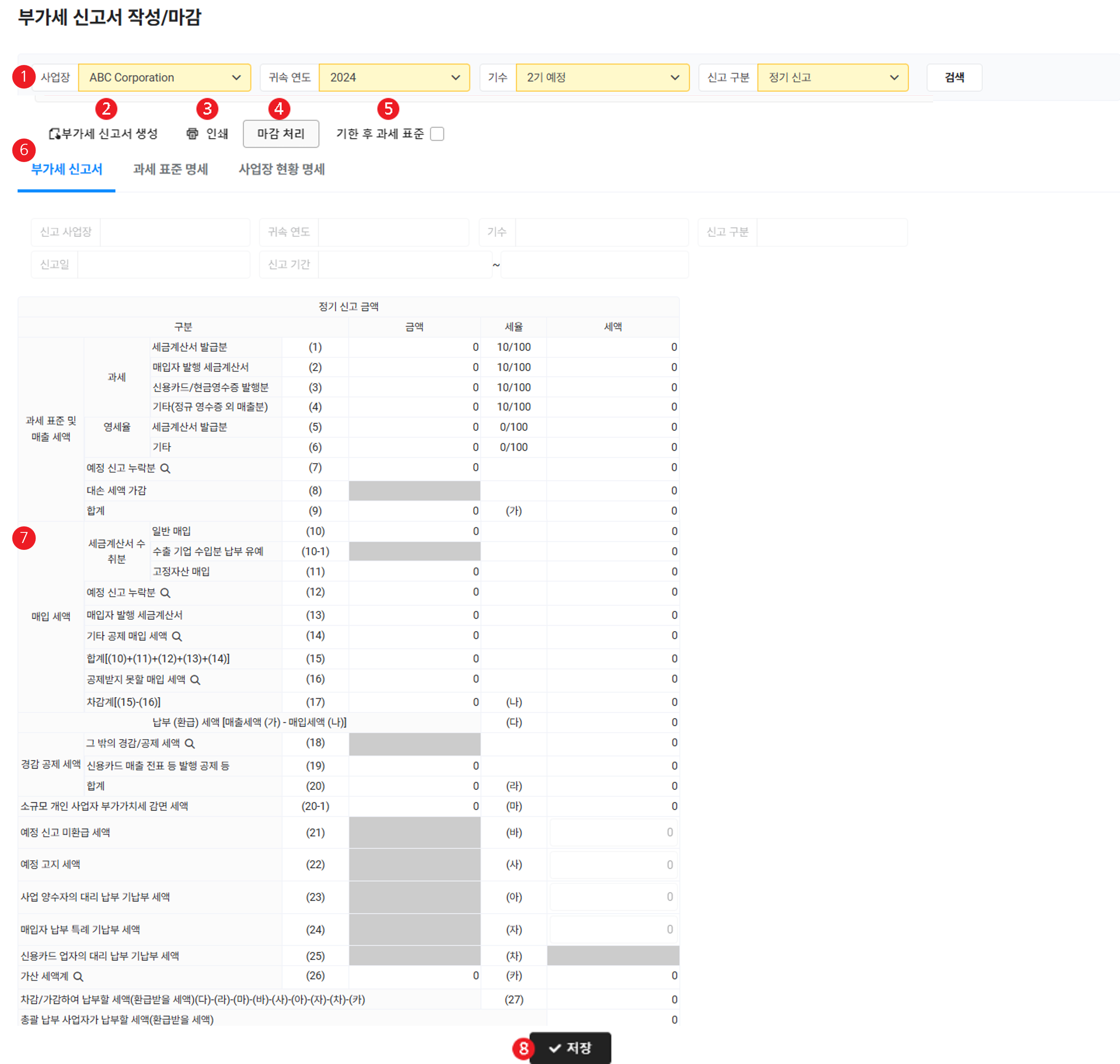 - 부가세 신고서, 과세 표준 명세: 각 탭 메뉴에서 내용을 입력한 후 '저장'을 클릭합니다.