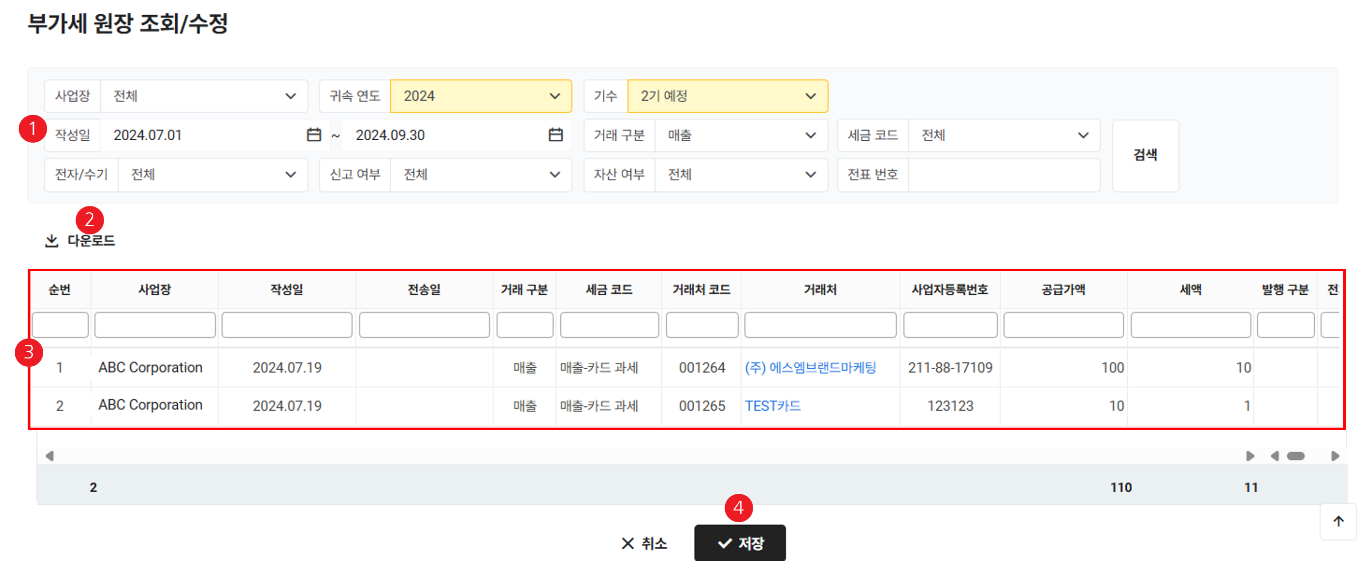 - 입력한 조건에 해당하는 부가세 데이터가 조회됩니다.