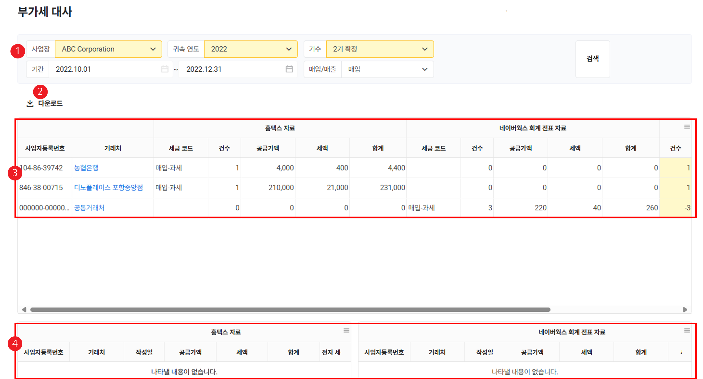 | ④ 부가세 대사 | 부가세 대사를 위해 ③번 영역에서 클릭한 자료의 홈택스 자료와 네이버웍스 회계 전표를 각각 표시 |
