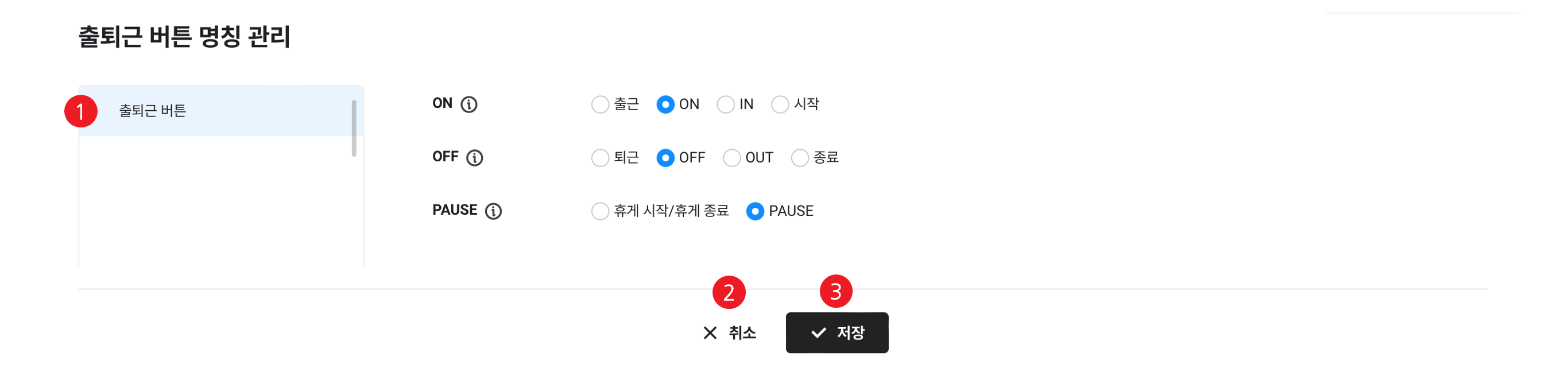 | ① 출퇴근 버튼 | 근무 시작 시점과 종료 시점을 의미하는 버튼 명칭을 설정