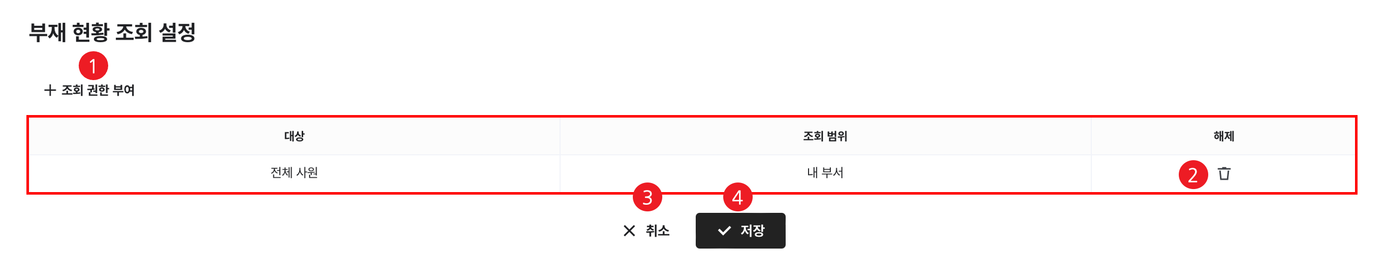 | ① 조회 권한 부여 | 부재 현황을 조회할 수 있는 대상과 조회 가능 범위 설정