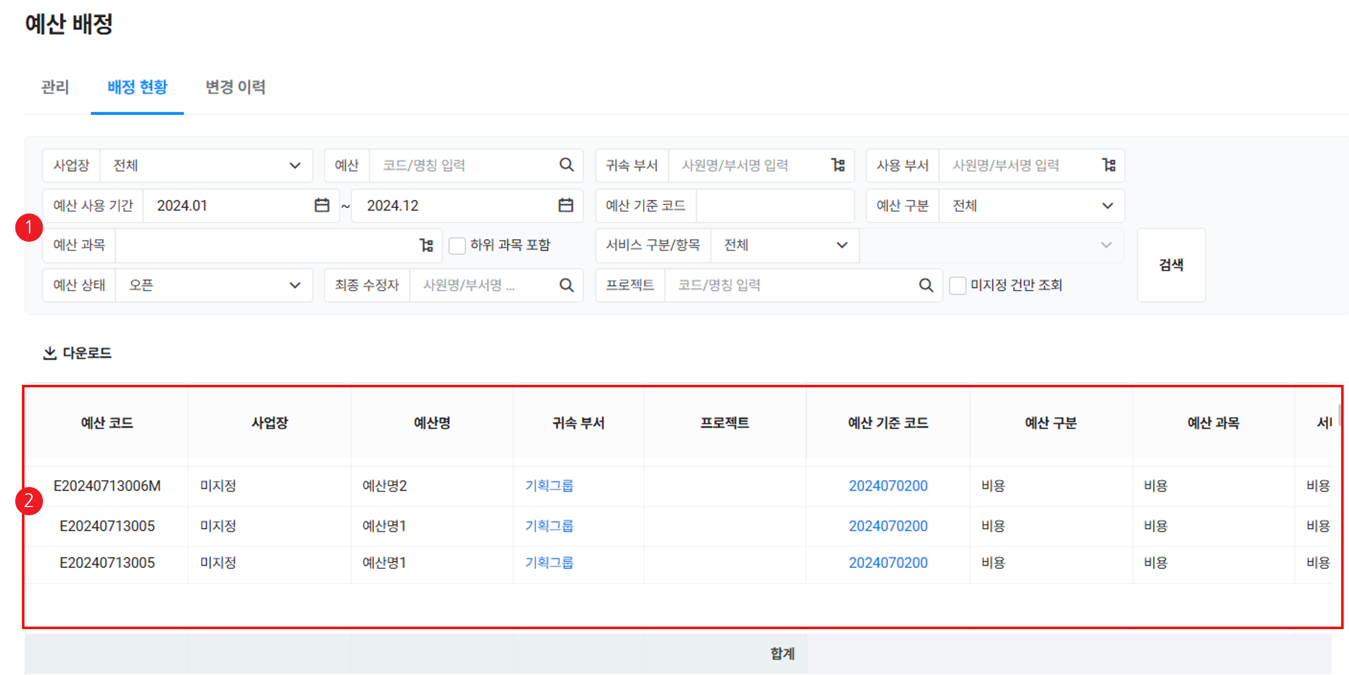 | ① 검색 창 | 예산 배정 현황을 사업장, 예산, 귀속 부서, 사용 부서, 예산 사용 기간, 예산 기준 코드, 예산 구분, 예산 과목, 서비스 구분/항목, 예산 상태, 최종 수정자, 프로젝트 조건으로 검색 가능 |
