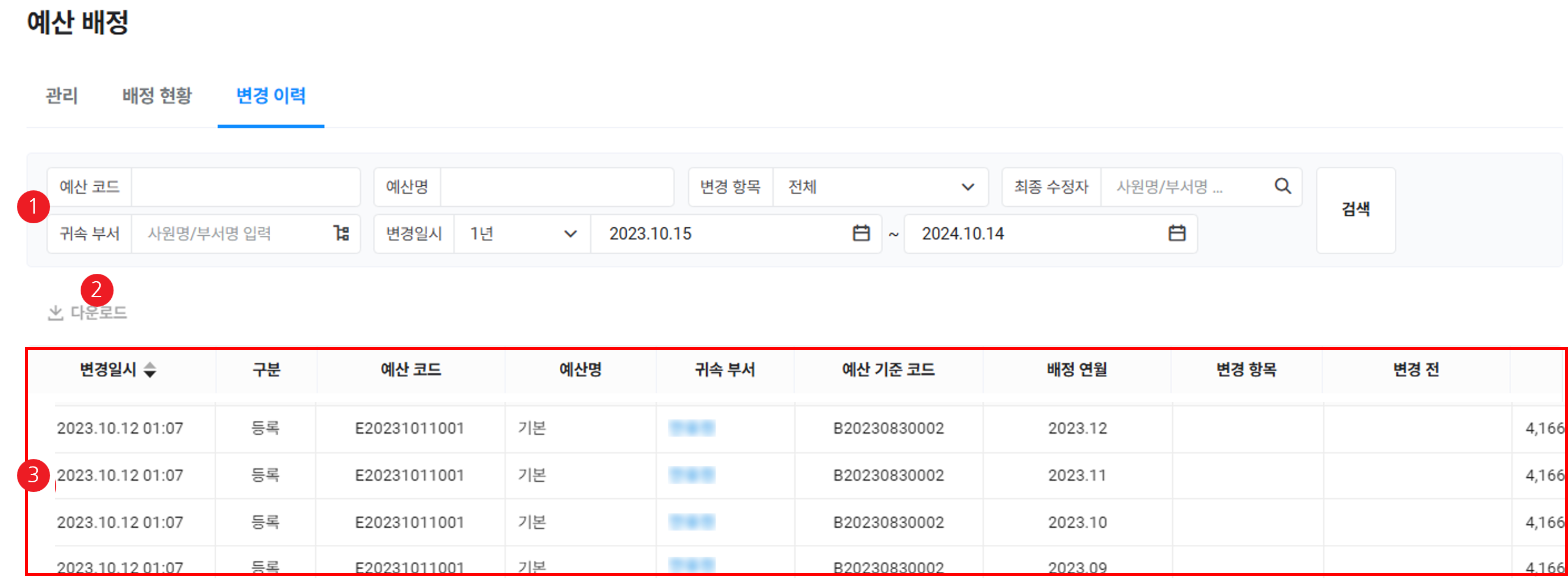 | ① 검색 창 | 예산 코드, 예산명, 변경 항목, 최종 수정자, 귀속 부서, 변경 일시 조건으로 검색 가능 |