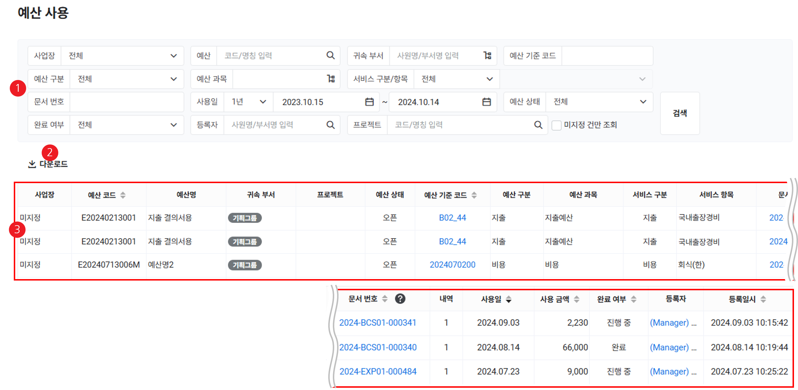 ① 검색 영역 예산 사용 현황을 사업장, 예산, 귀속 부서, 예산 기준 코드, 예산 구분, 예산 과목, 서비스 구분/항목, 문서 번호, 사용일, 완료 여부, 등록자, 프로젝트 조건으로 검색