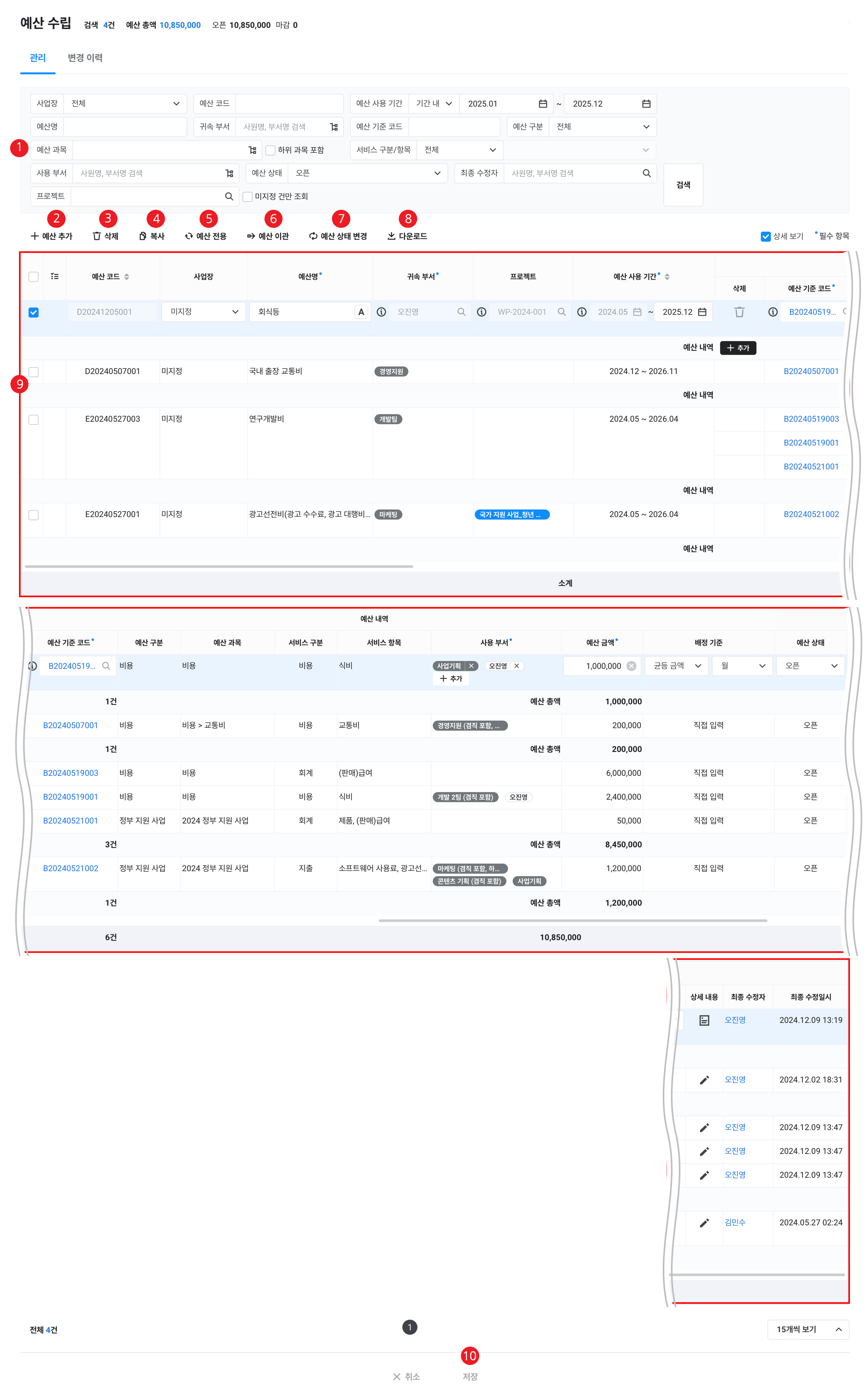 예산 수립의 변경 이력을 조회할 수 있습니다.