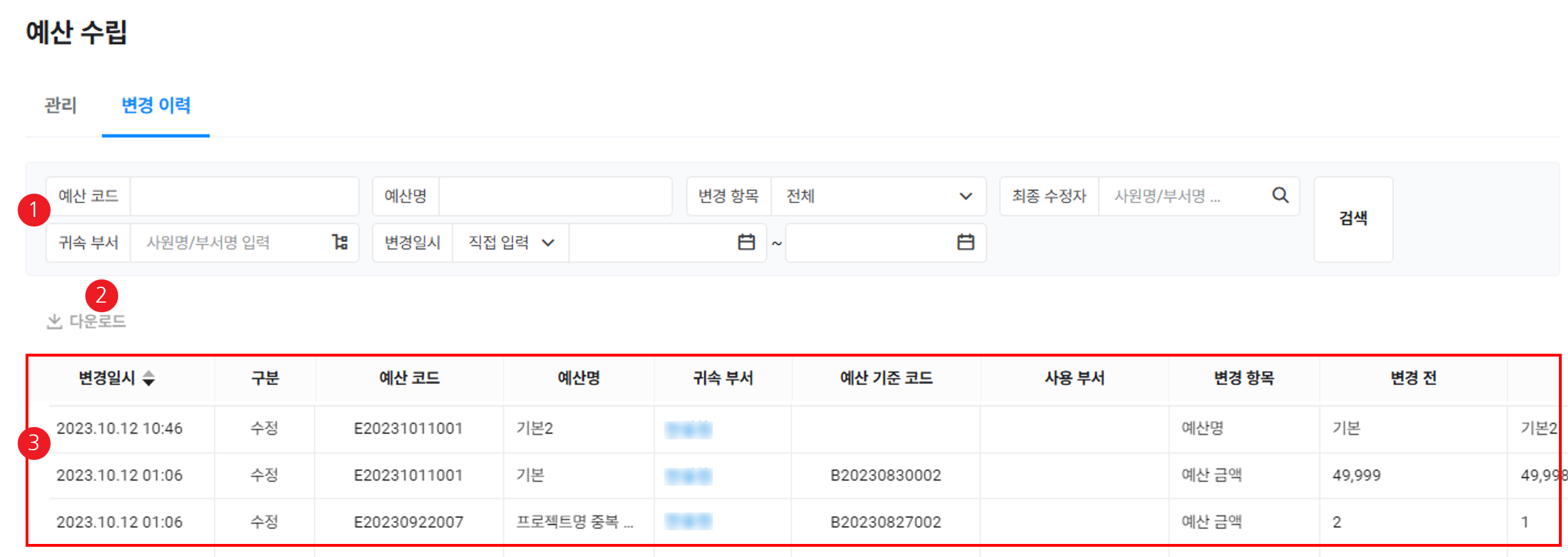 | ① 검색창 | 예산 코드, 예산명, 변경 항목, 귀속 부서, 최종 수정자, 변경 일시 조건에 따라 검색 |