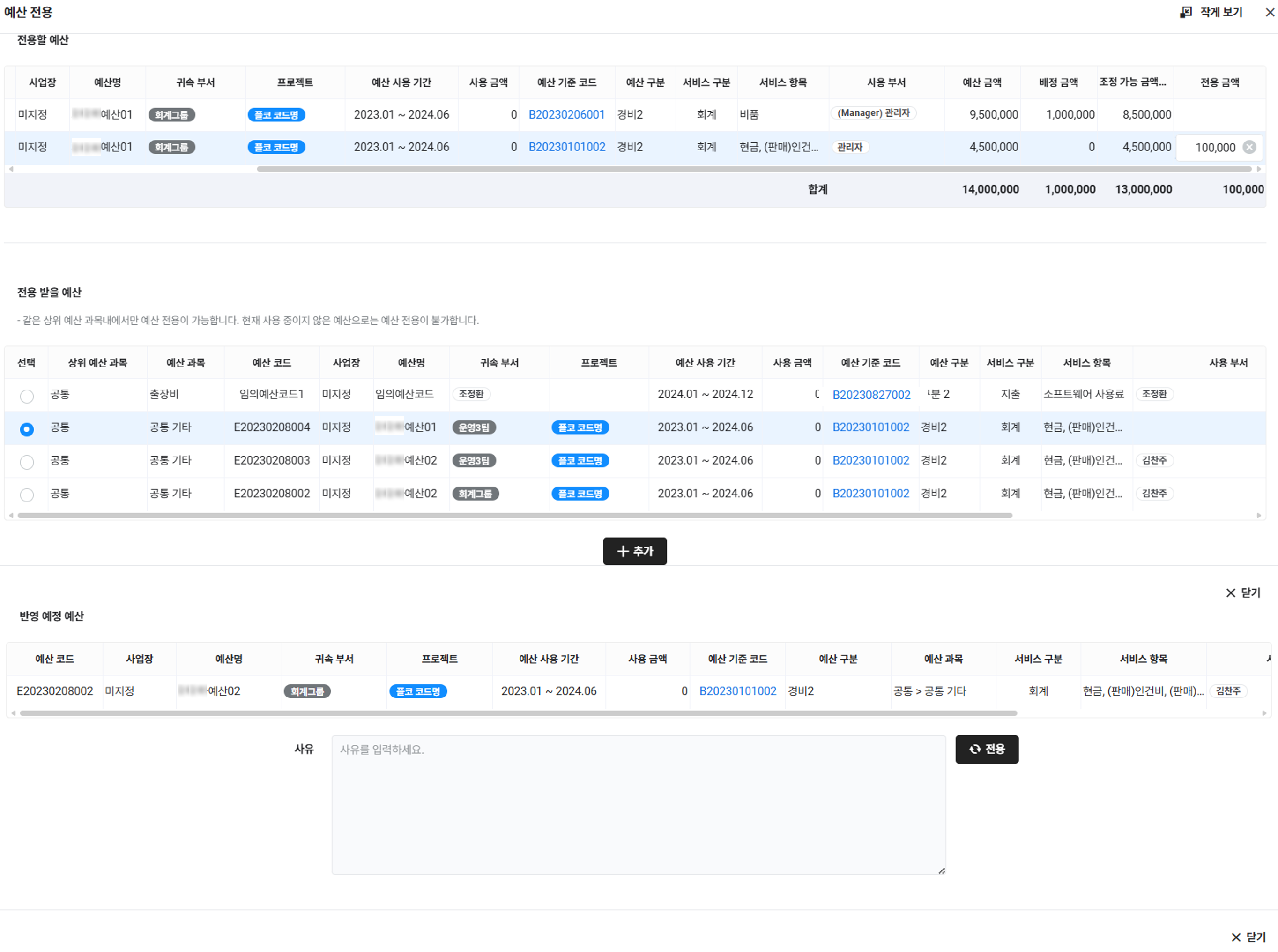 예산 전용은 수립된 예산 중 배정하고 남은 잔액 내에서 상위 예산 과목이 동일한 범주 내의 다른 예산 과목으로 변경할 수 있습니다.(예산 과목 설정 참조)