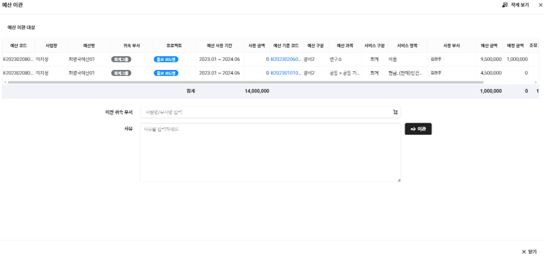 - 사업장, 예산명, 프로젝트 코드, 예산 사용 기간, 예산 기준, 사용 부서가 이관 전 예산과 동일하게 표시됩니다.