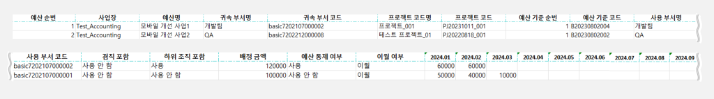 - 필요 데이터: 예산 기준 코드, 사용 여부(사용), 항목 사용 여부(사용)