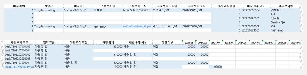 하나의 예산에 예산 기준 코드, 사용 부서를 여러 개 적용 시 작성 예시:
