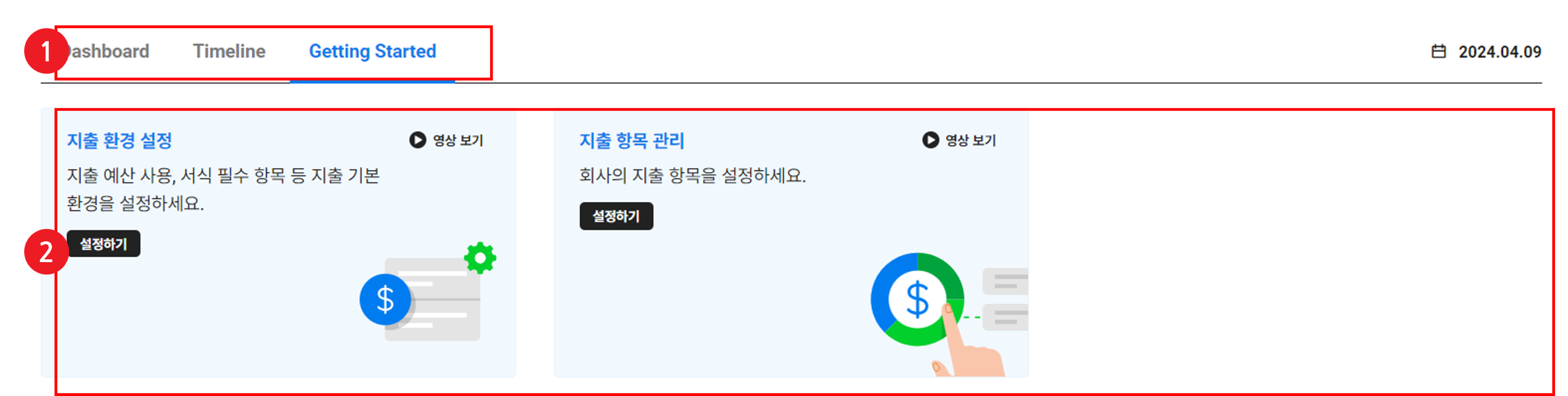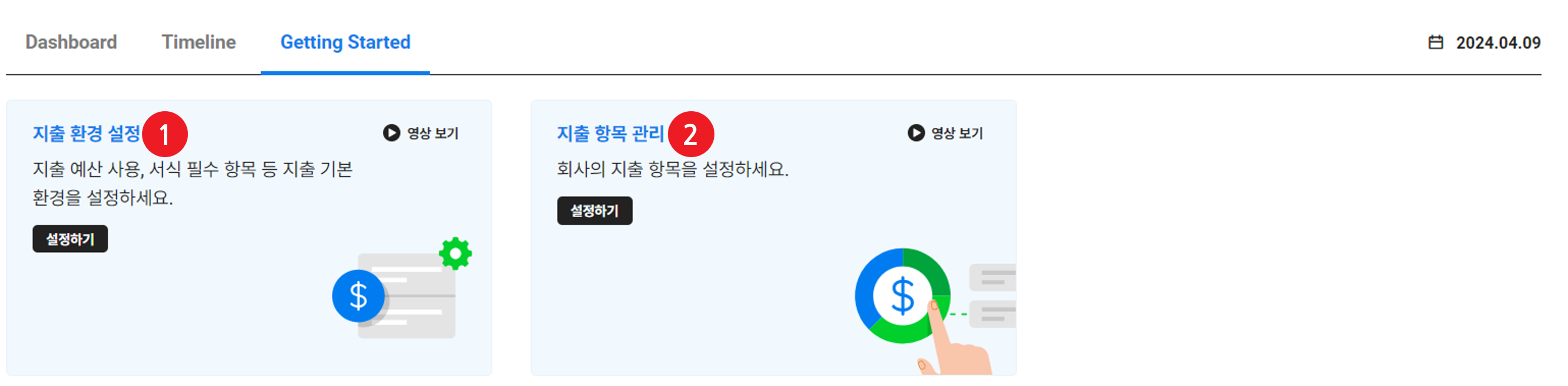 지출 서비스를 원활히 사용하기 위해서는 Getting Started 화면의 카드 순서에 따라 모든 항목의 설정을 완료해 주십시오.