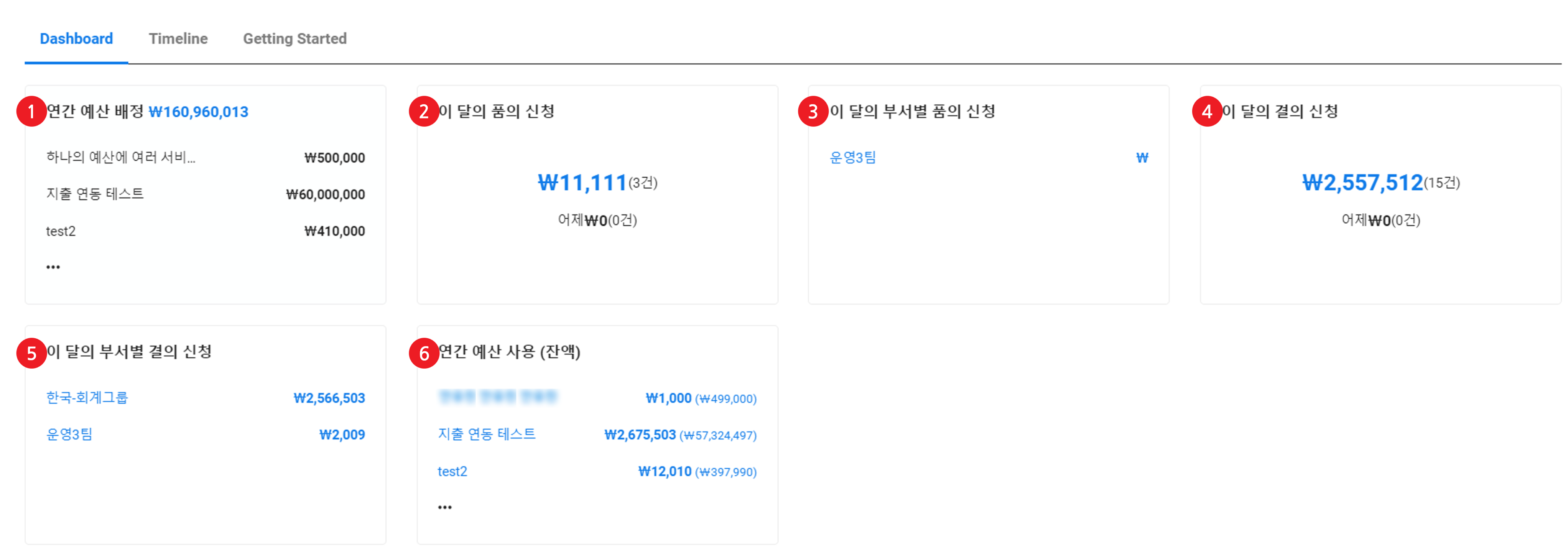 Getting Started 화면의 모든 설정을 완료한 후에는, 지출 서비스에 접속하면 Dashboard 화면이 나타납니다. Dashboard 화면에는 지출 관련 요약 정보가 카드 형태로 표시됩니다.