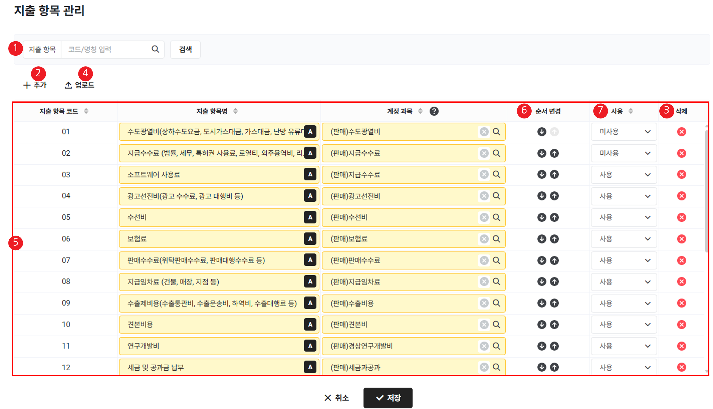 | ⑦ 사용 | 지출 항목의 사용 여부 표시 및 변경(지출 항목 사용 여부 변경 참고) |