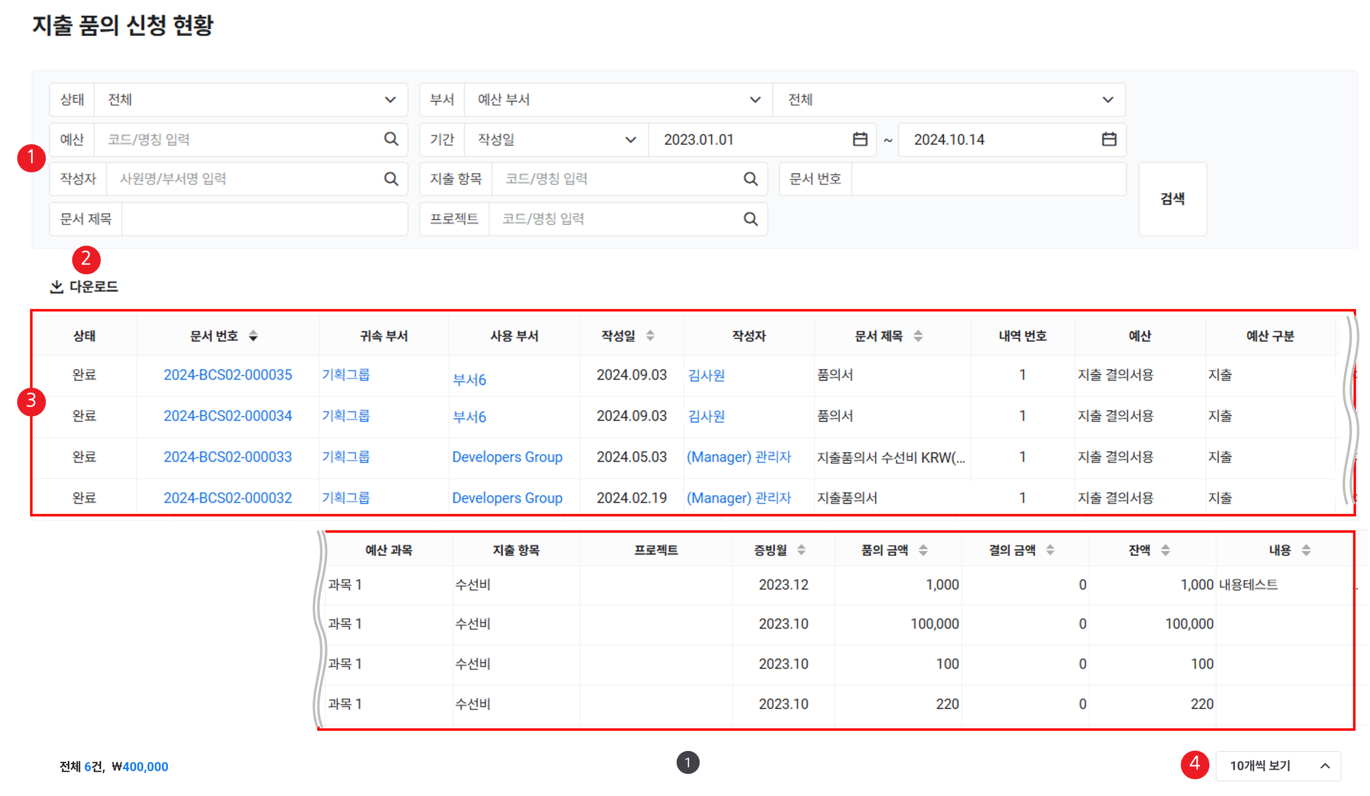 ① 검색창 지출 품의 신청 현황을 상태, 예산, 부서, 기간, 예산명, 작성자, 지출 항목, 문서 번호, 문서 제목, 프로젝트 코드에 따라 검색