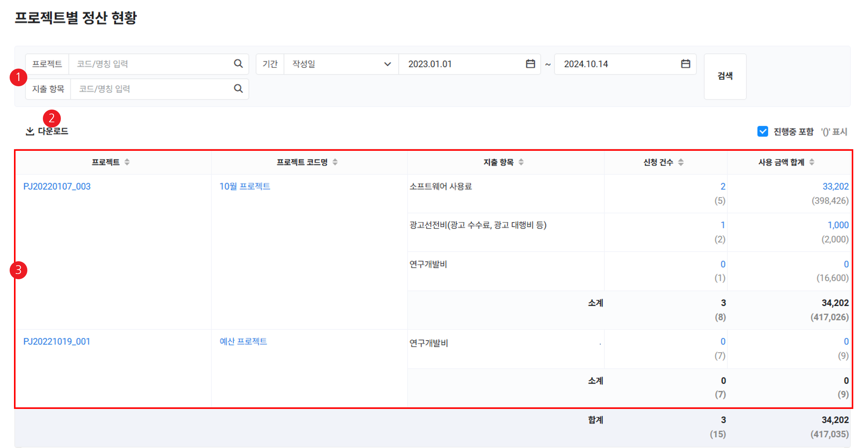 | ③ 프로젝트 코드별 정산 현황 목록 | 프로젝트 코드별 정산 현황을 목록으로 확인