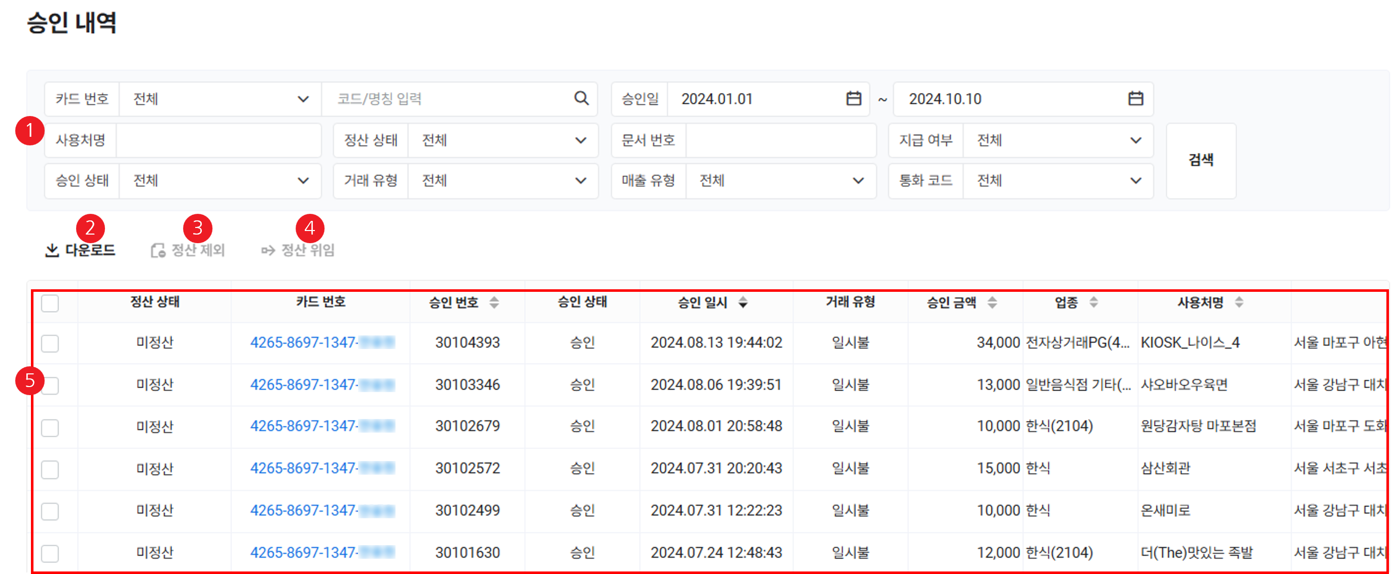 | ⑤ 승인 내역 목록 | 거래 승인 내역을 목록으로 확인