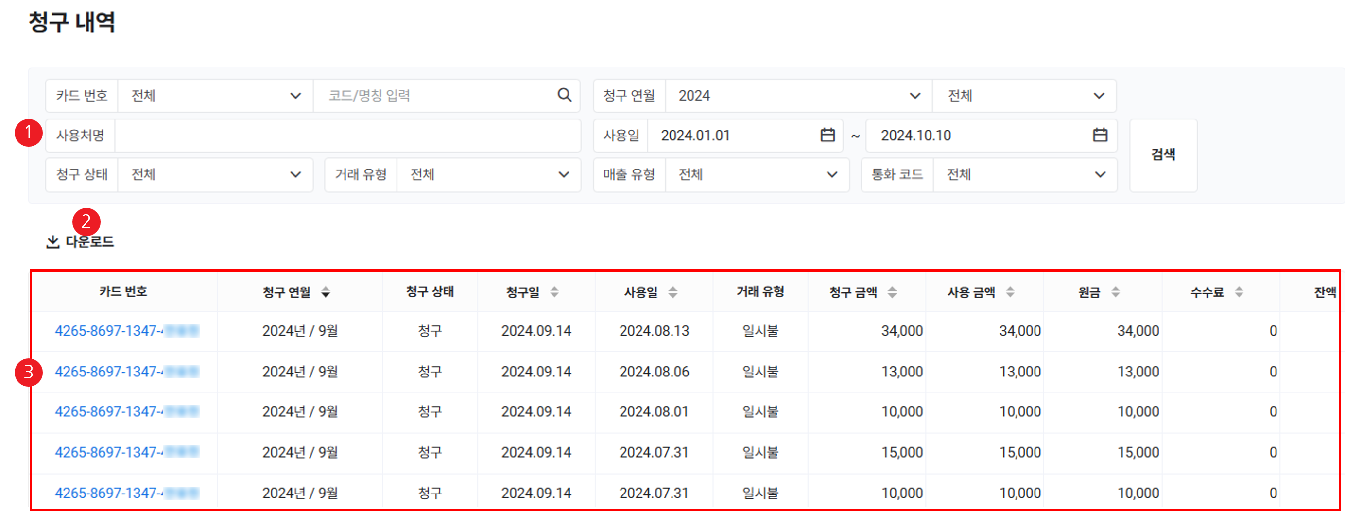| ① 검색 창 | 청구 내역을 카드 번호, 청구 연월, 사용처명, 사용일, 청구 상태, 거래 유형, 매출 유형, 통화 코드 조건에 따라 검색 |