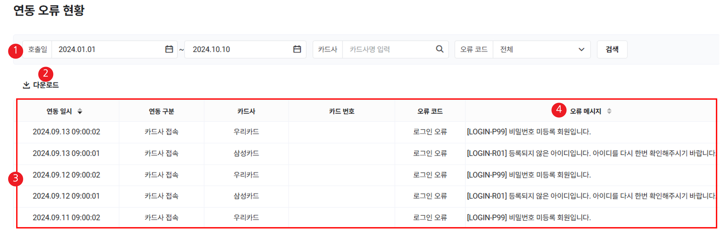 | ① 검색 창 | 연동 오류 현황을 호출일, 카드사, 오류 코드 조건에 따라 검색 |