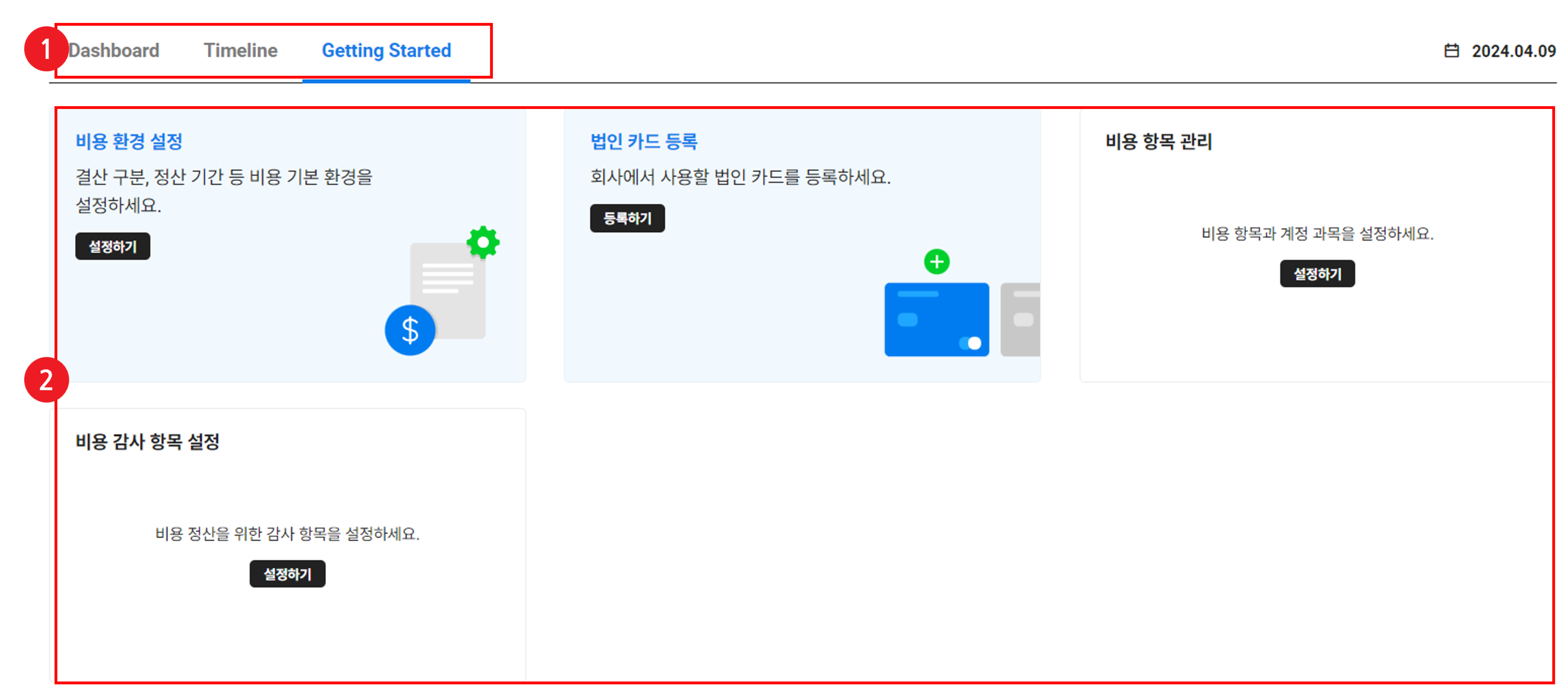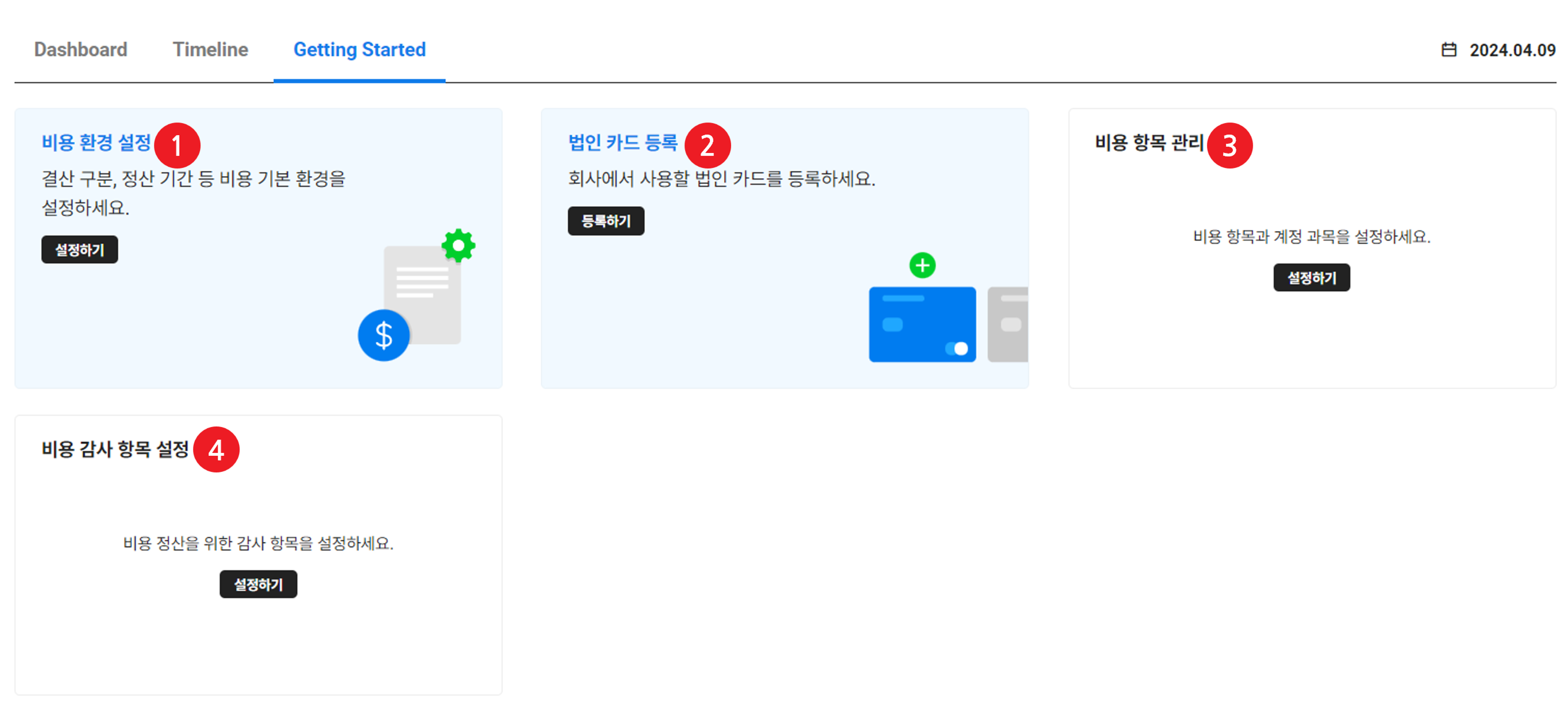 비용 서비스에 처음으로 접속하면 비용 관련 정보 설정을 안내하는 Getting Started 화면이 나타납니다. 각 설정 항목은 닫혀진 카드 형태로 표시되며, 카드를 한 번 클릭하면 카드가 열려 기본 반영 사항이 표시되고, 한 번 더 클릭하면 해당 메뉴로 이동합니다.