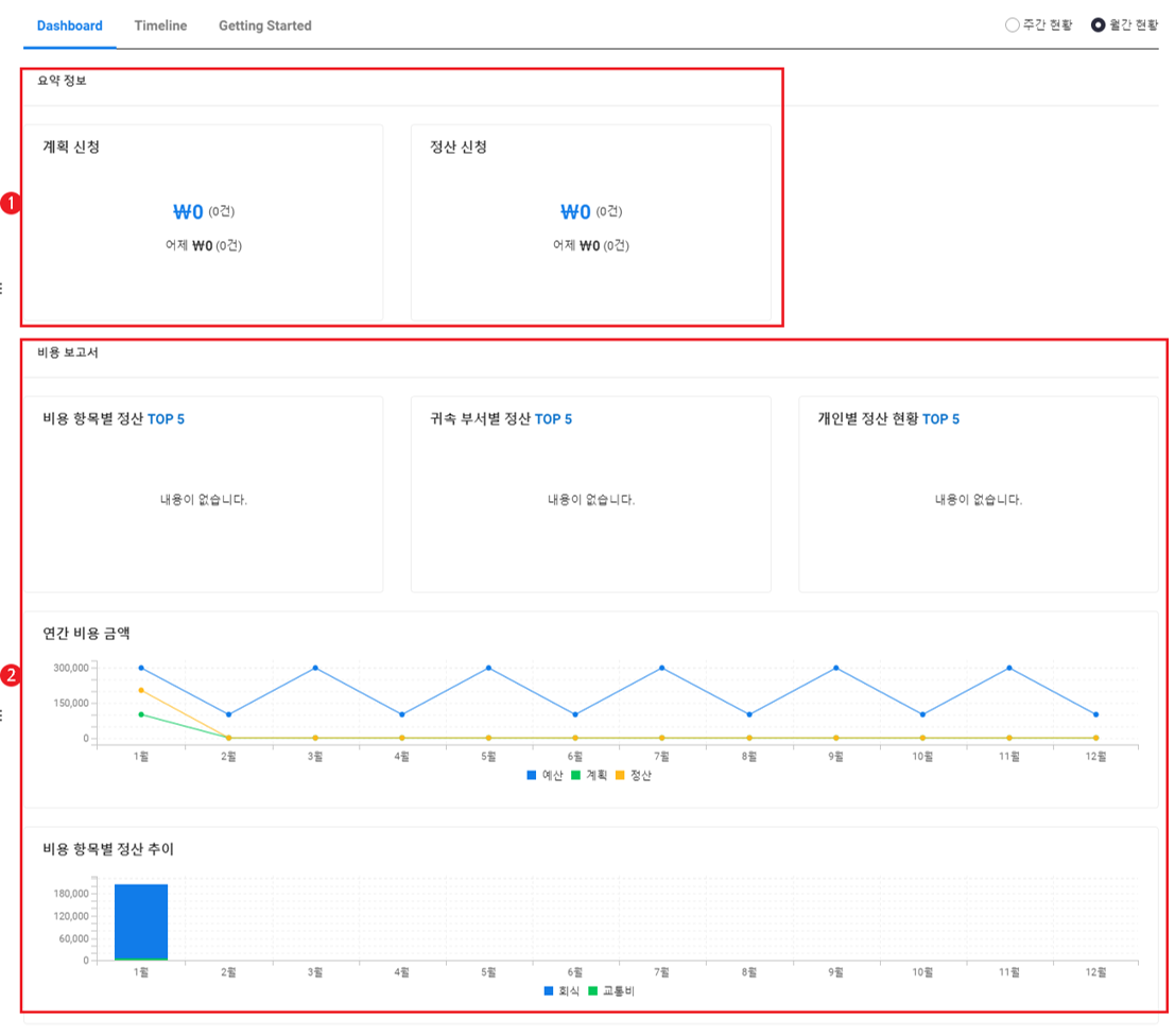 비용 메인 화면은 다음과 같이 구성되어 있습니다.