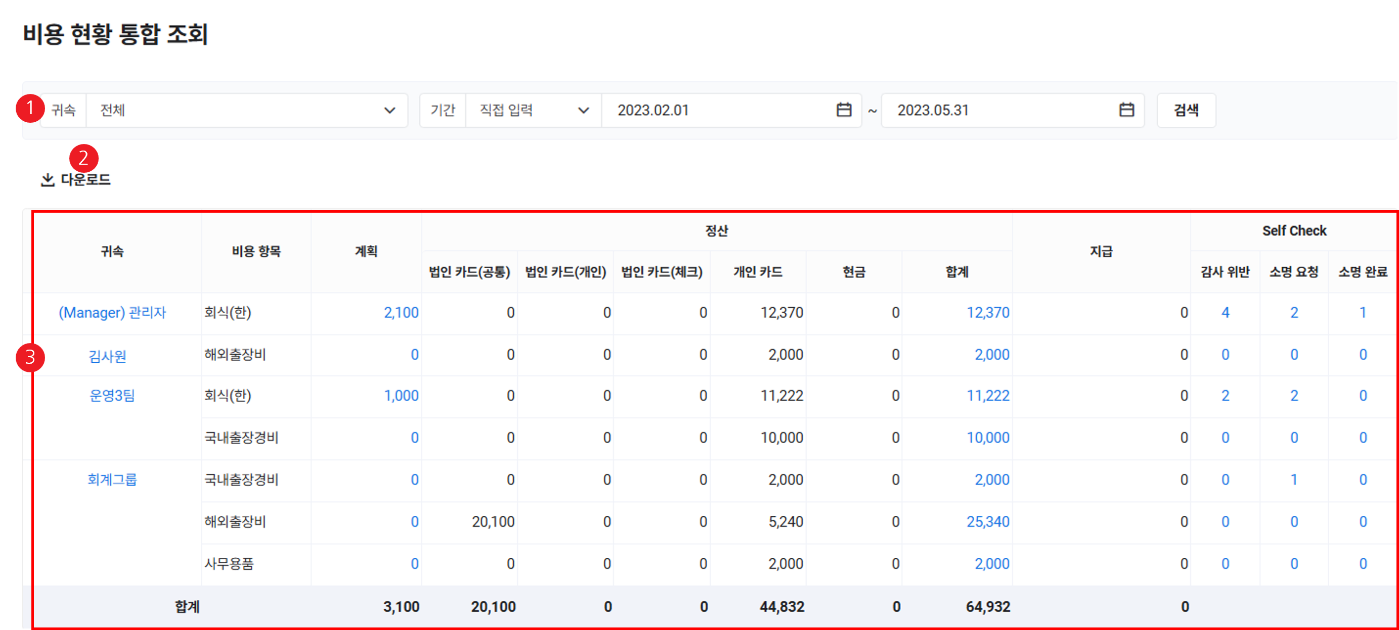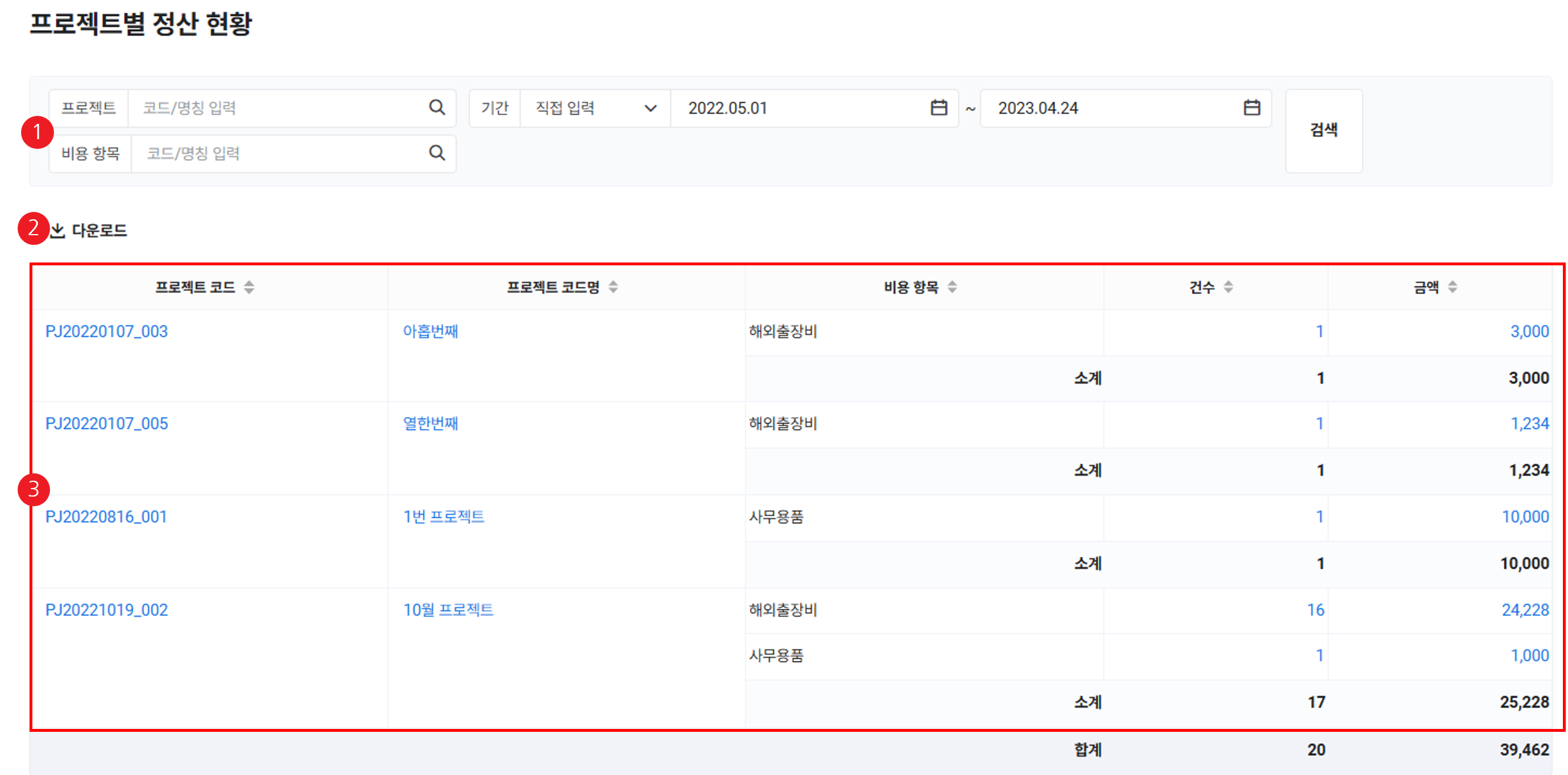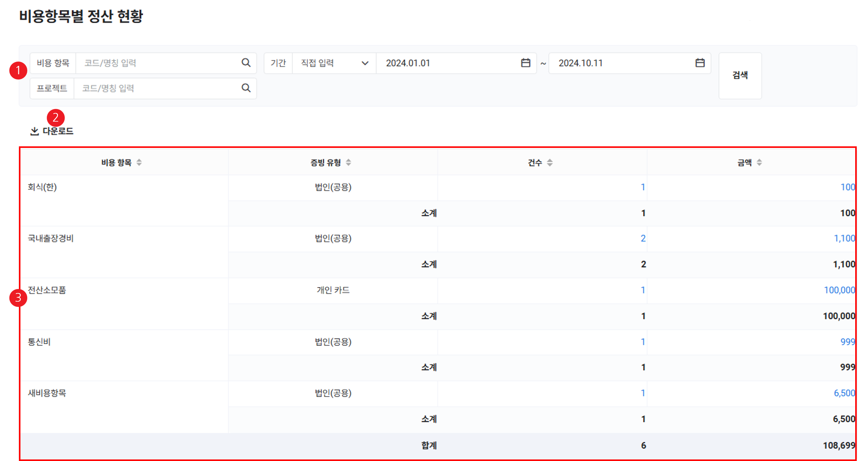 - 입력한 조건에 해당하는 비용 항목별 정산 현황이 조회됩니다.