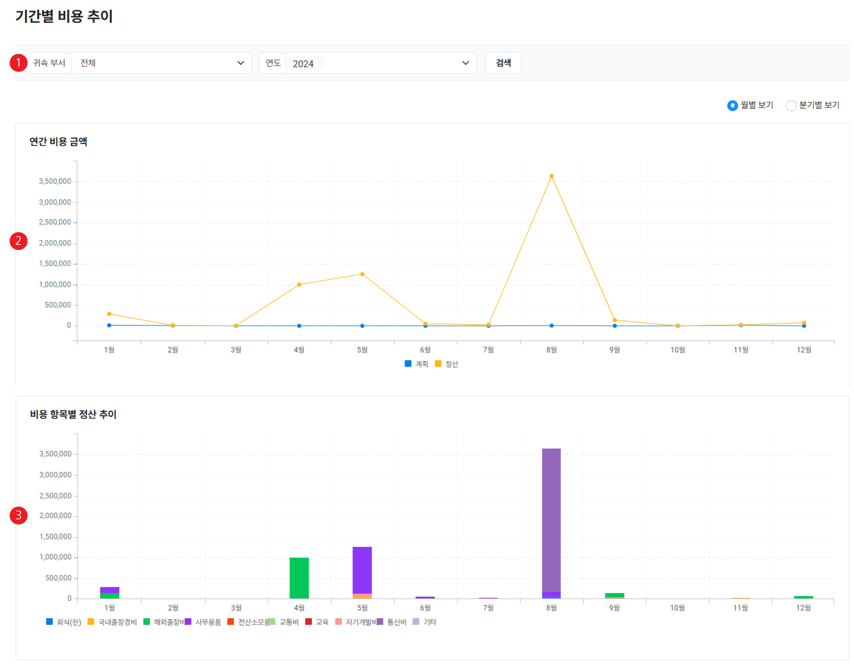 | ② 연간 비용 금액 | 연간 예산, 비용 계획, 정산 금액을 월별 또는 분기별 차트로 표시