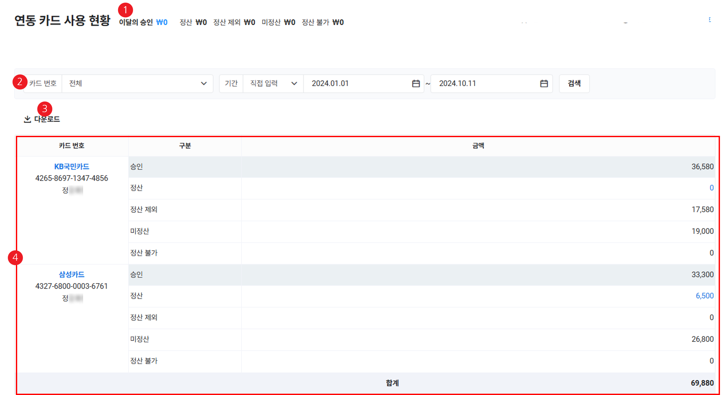 | ④ 연동카드 사용 현황 목록 | 월별 또는 분기별 법인 카드 사용 현황을 목록으로 확인