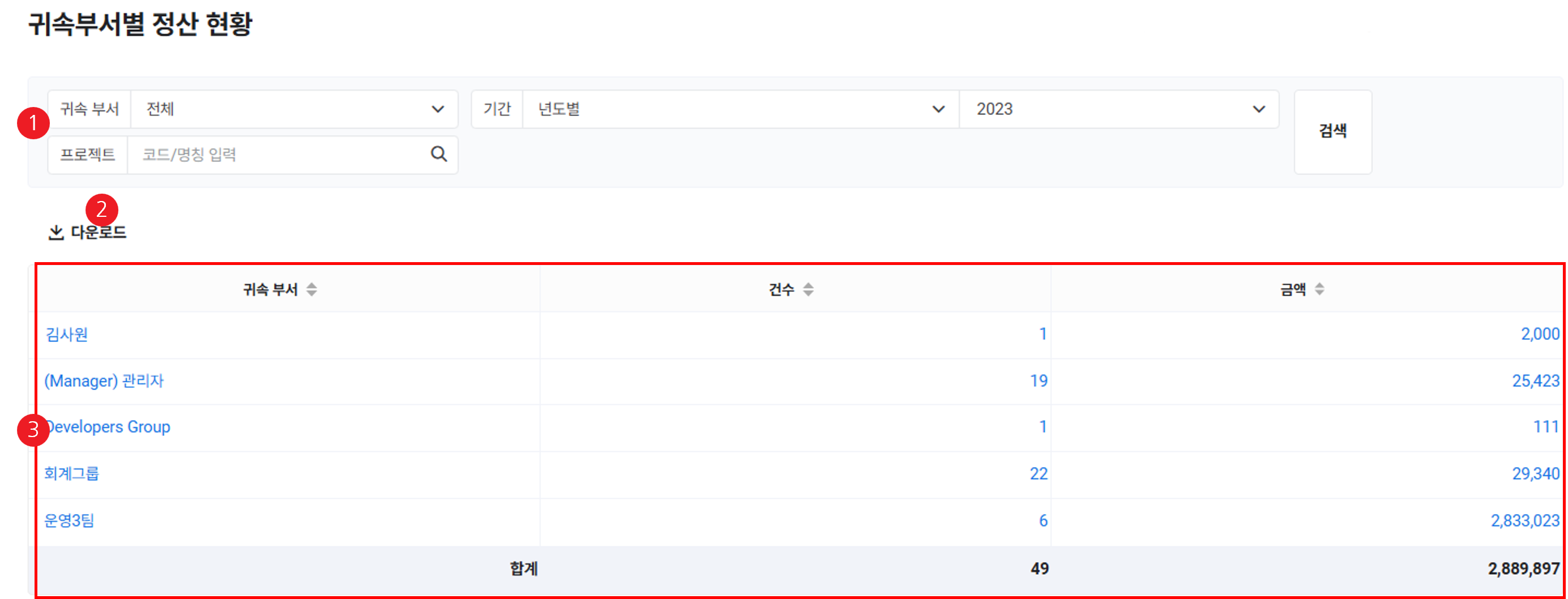 | ② 다운로드 | 귀속 부서별 정산 목록을 엑셀 파일로 다운로드(귀속 부서별 정산 목록 다운로드 참고) |