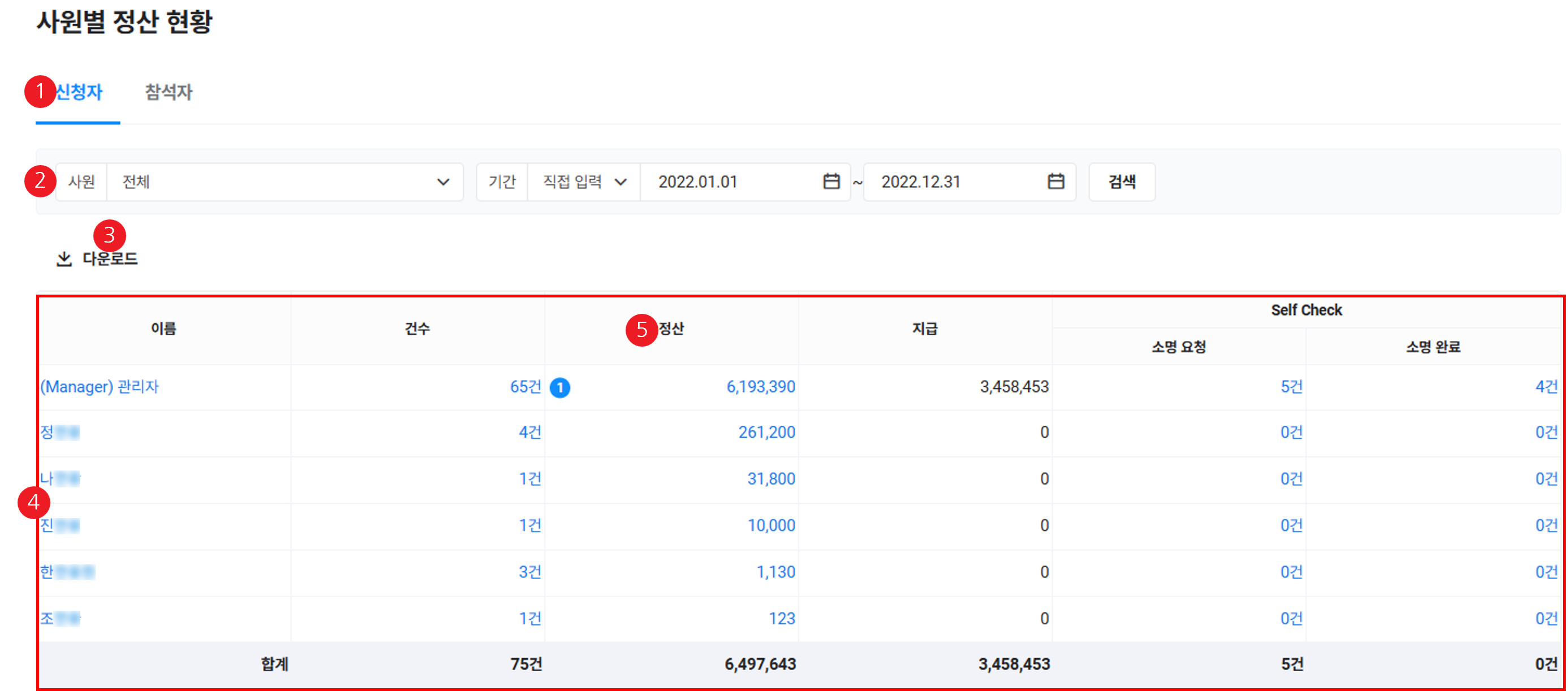 | ④ 사원별 정산 현황 목록 | 선택 기간 내 각 사원의 정산 현황을 목록으로 확인