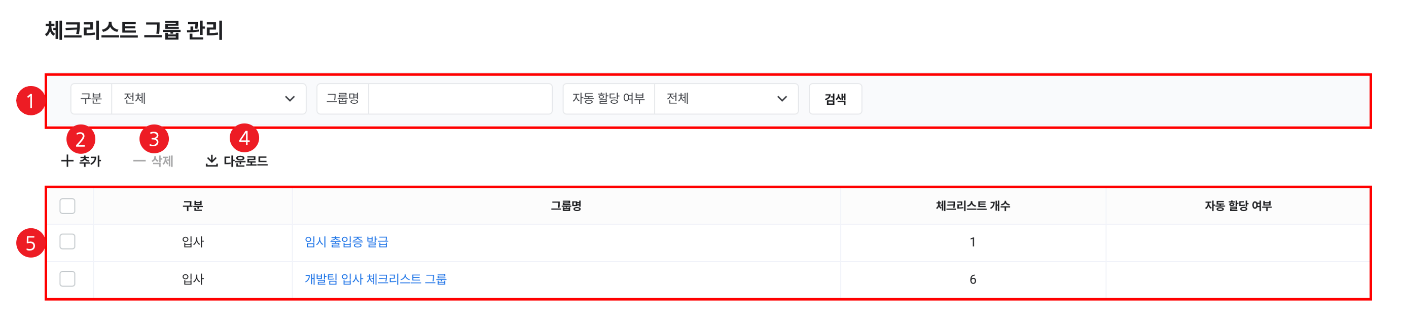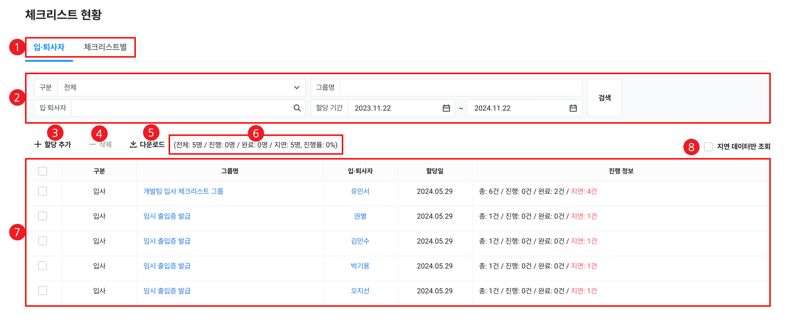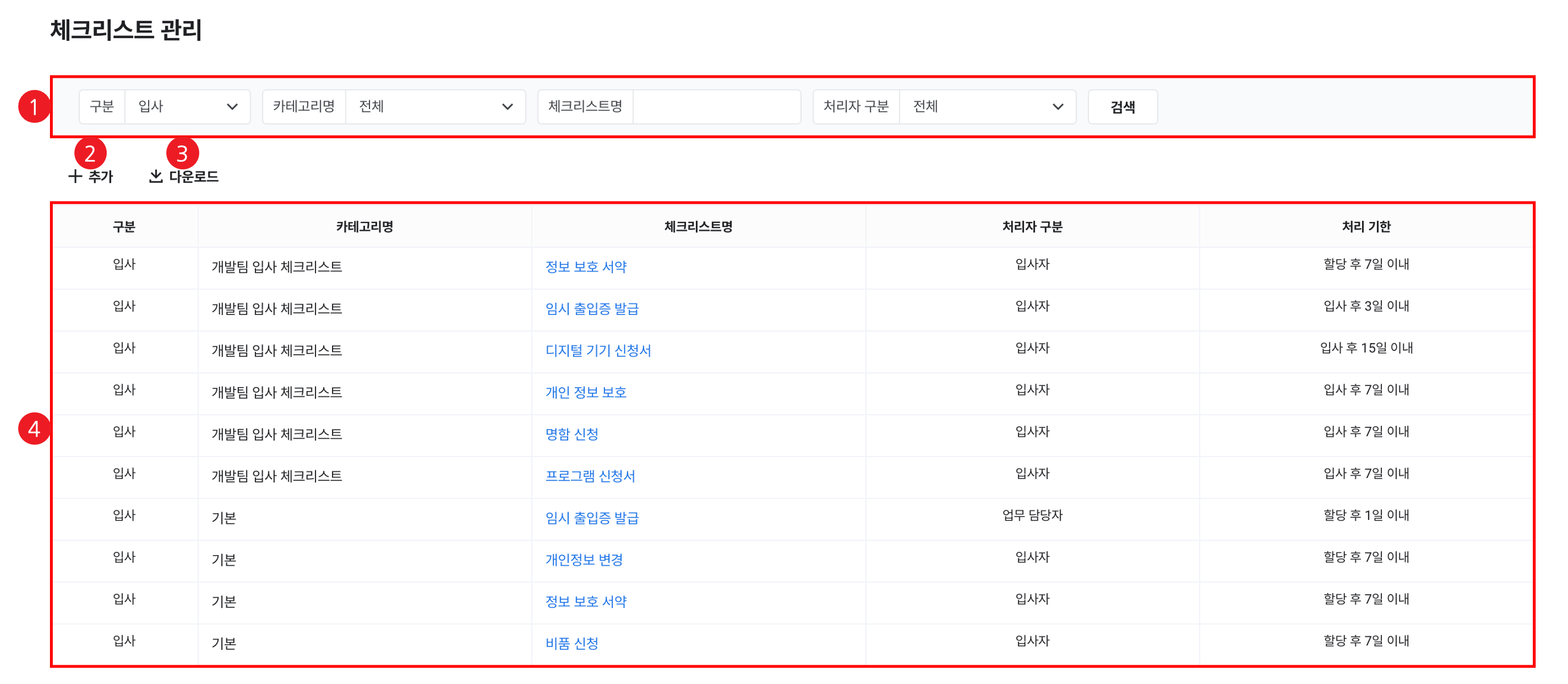 | ② 검색창 | 체크리스트를 구분, 그룹명, 입·퇴사자, 할당 기간, 처리자, 체크리스트명, 업무 담당자, 상태에 따라 검색 |