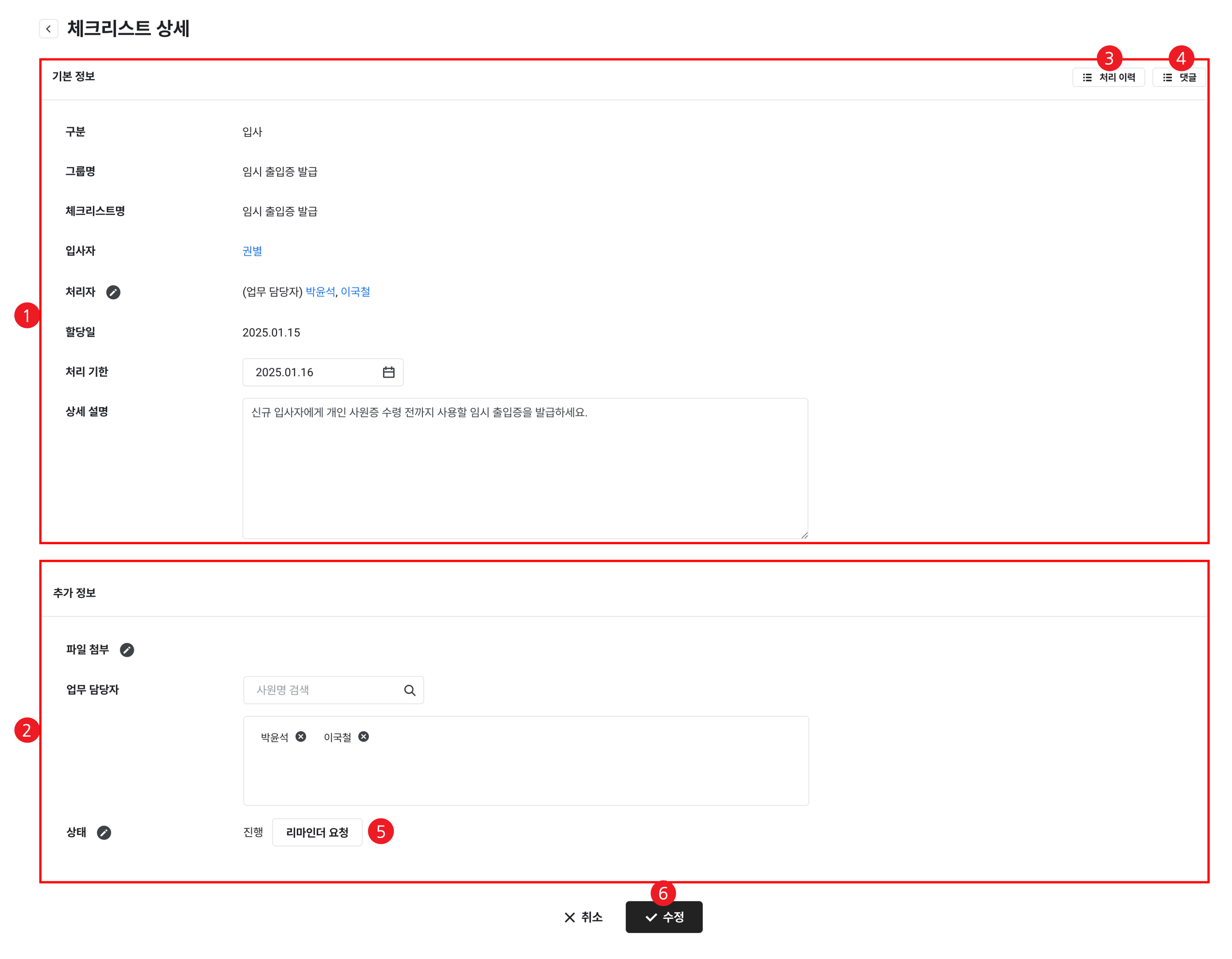 | ③ 처리 이력 | 체크리스트 할당, 수정, 리마인더 요청 및 완료 이력 표시