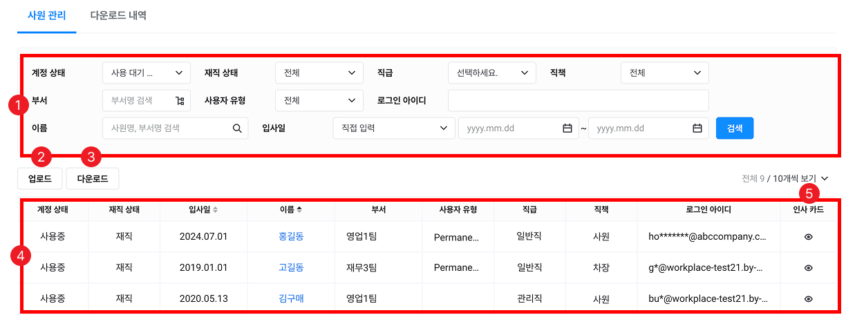 | ① 검색창 | 계정 상태, 재직 상태, 직급, 직책, 부서, 사용자 유형, 로그인 아이디, 이름, 입사일에 따라 사원을 검색