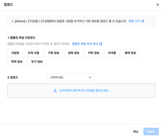 - 부가 정보 템플릿은 관리자가 설정 > 인사 정보 설정에서 부가 정보를 추가한 경우에만 표시됩니다. 일괄 업로드할 부가 정보가 있는 경우, 인사 정보 설정 메뉴에서 부가 정보를 먼저 추가해 주십시오.
