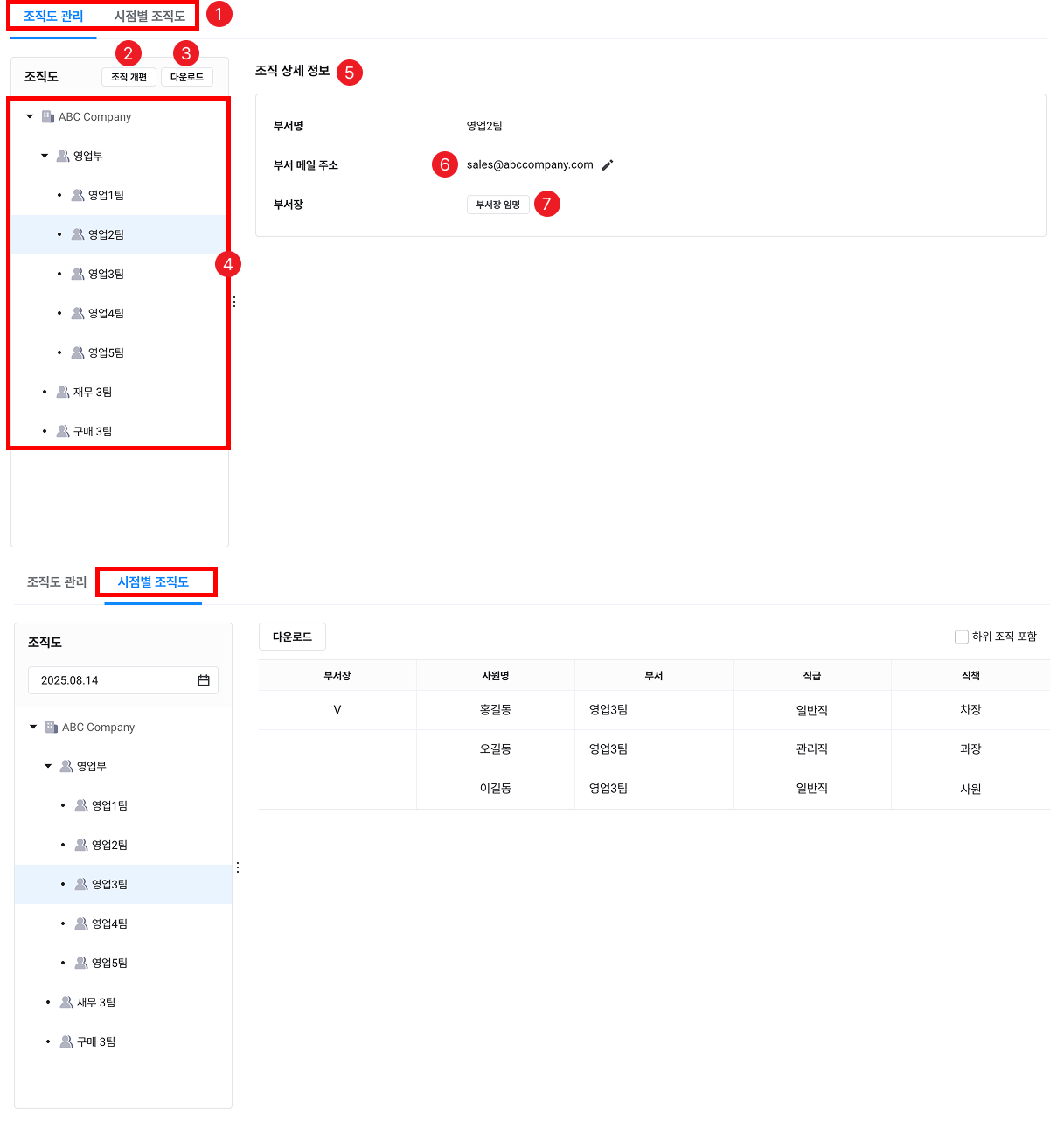 | ① 콘텐츠 탭 | 조직도 관리: 현재 조직도 확인하고 관리 시점별 조직도: 과거 시점의 조직도를 날짜별로 확인. 회사에 부서가 없는 경우 시점별 조직도 표시 안 함