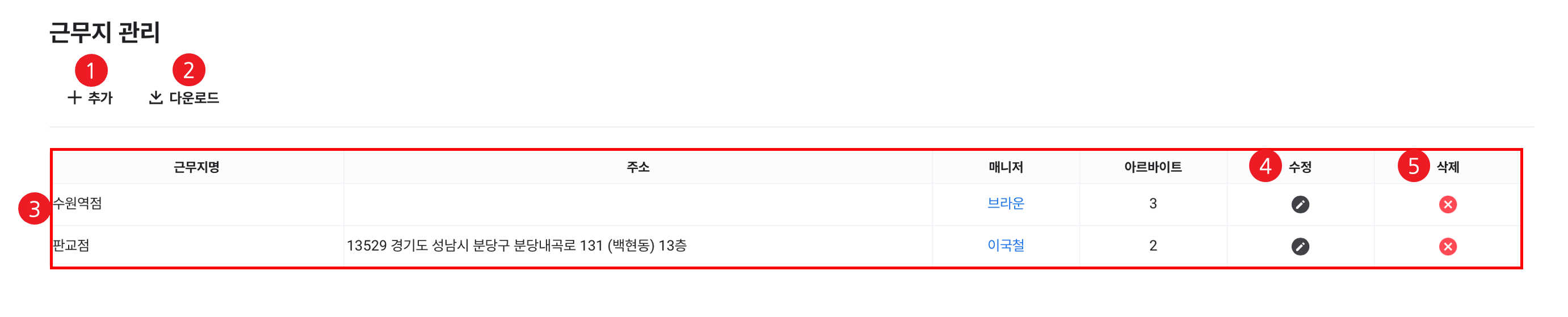 근무지 관리 화면은 다음과 같이 구성되어 있습니다.