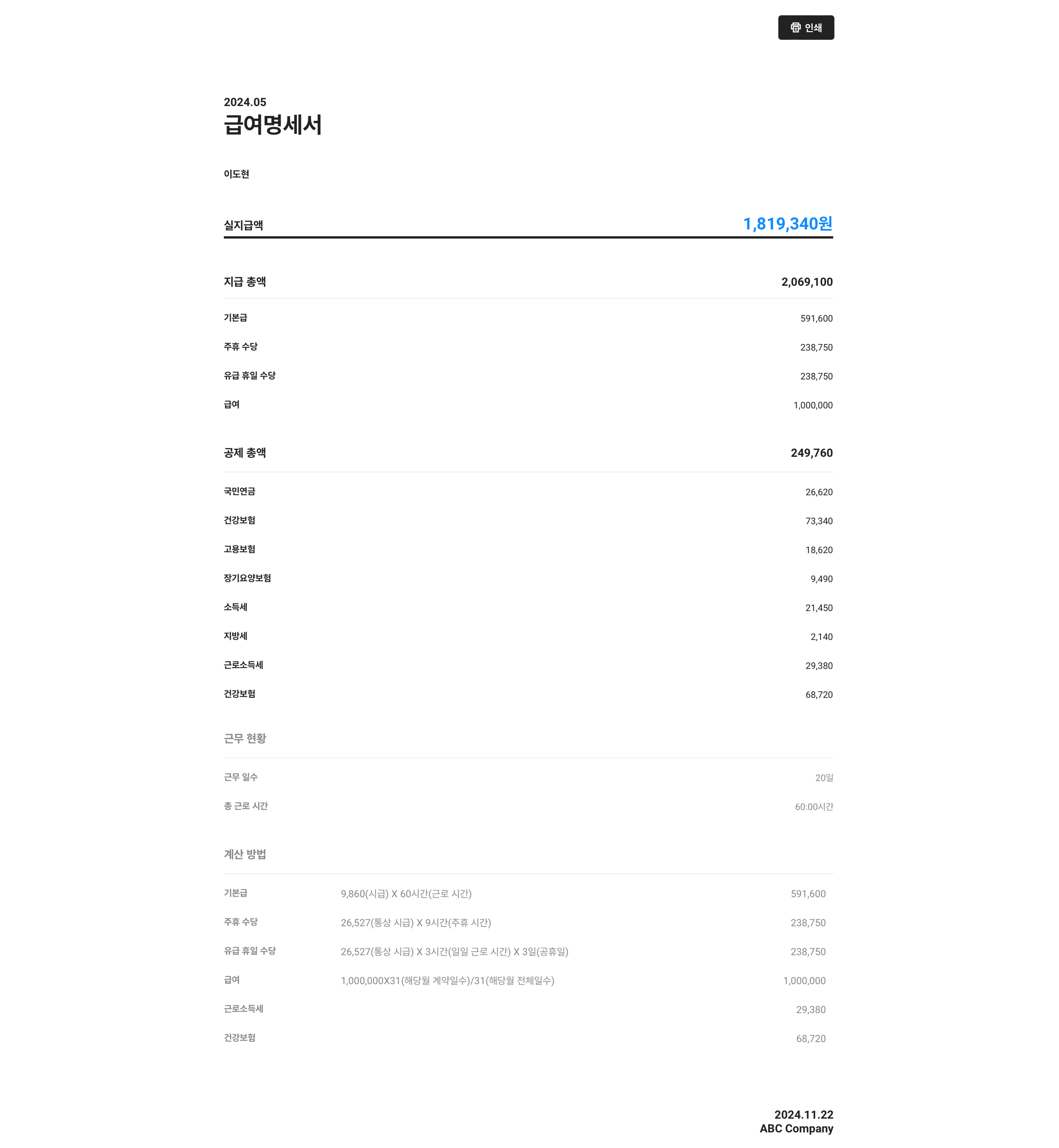 - '인쇄'를 클릭하면 급여명세서 상세 내역을 인쇄할 수 있습니다.