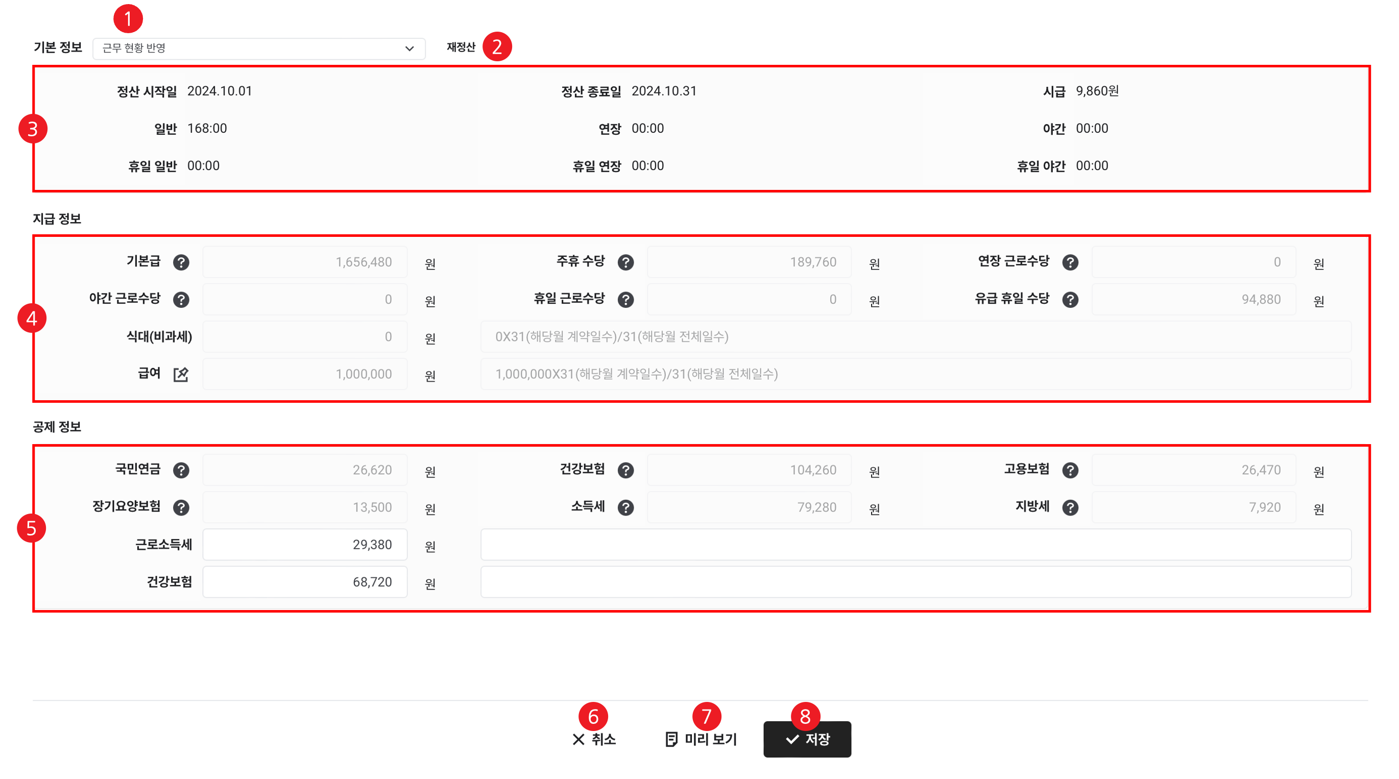 | ⑥ 취소 | 수정을 취소하고 급여 정산 화면으로 이동 |