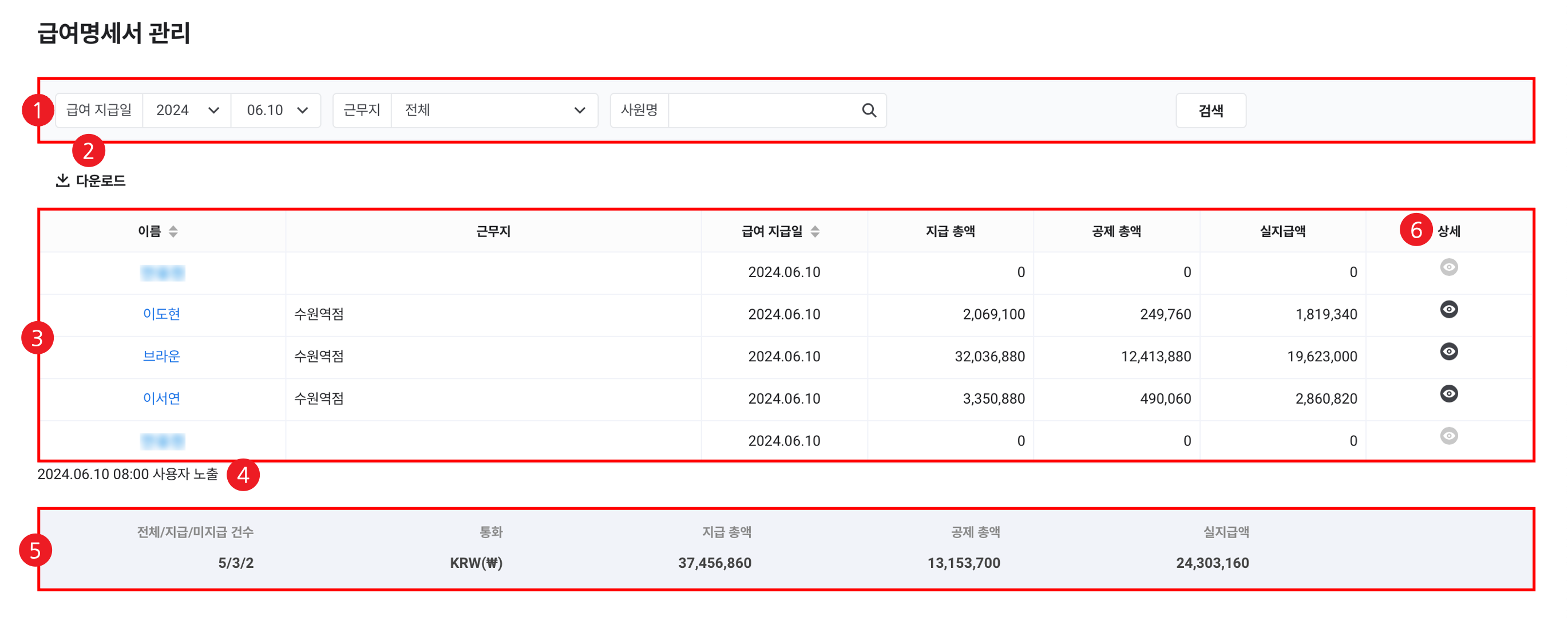 | ② 검색창 | 급여 정산 내역을 근무지, 사원명 조건에 따라 검색 |