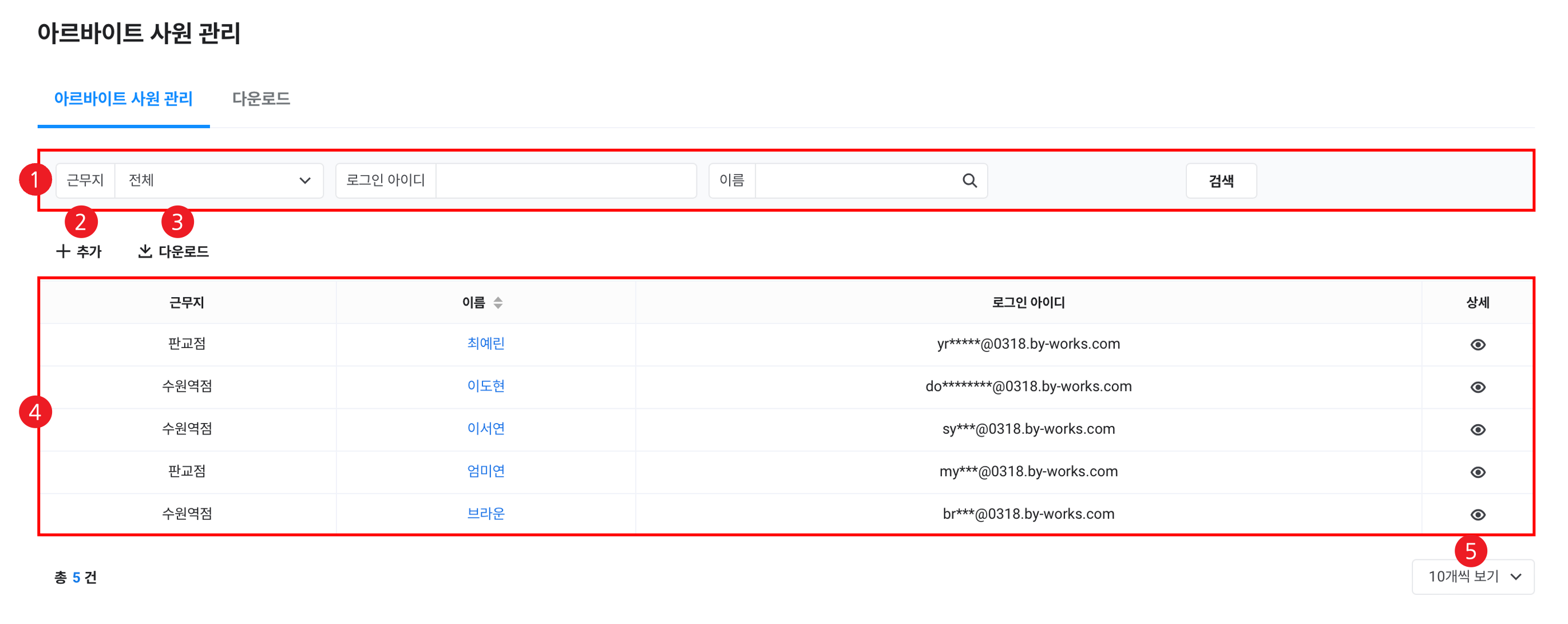 | ① 검색창 | 아르바이트 사원을 근무지, 로그인 아이디, 사원명에 따라 검색 |