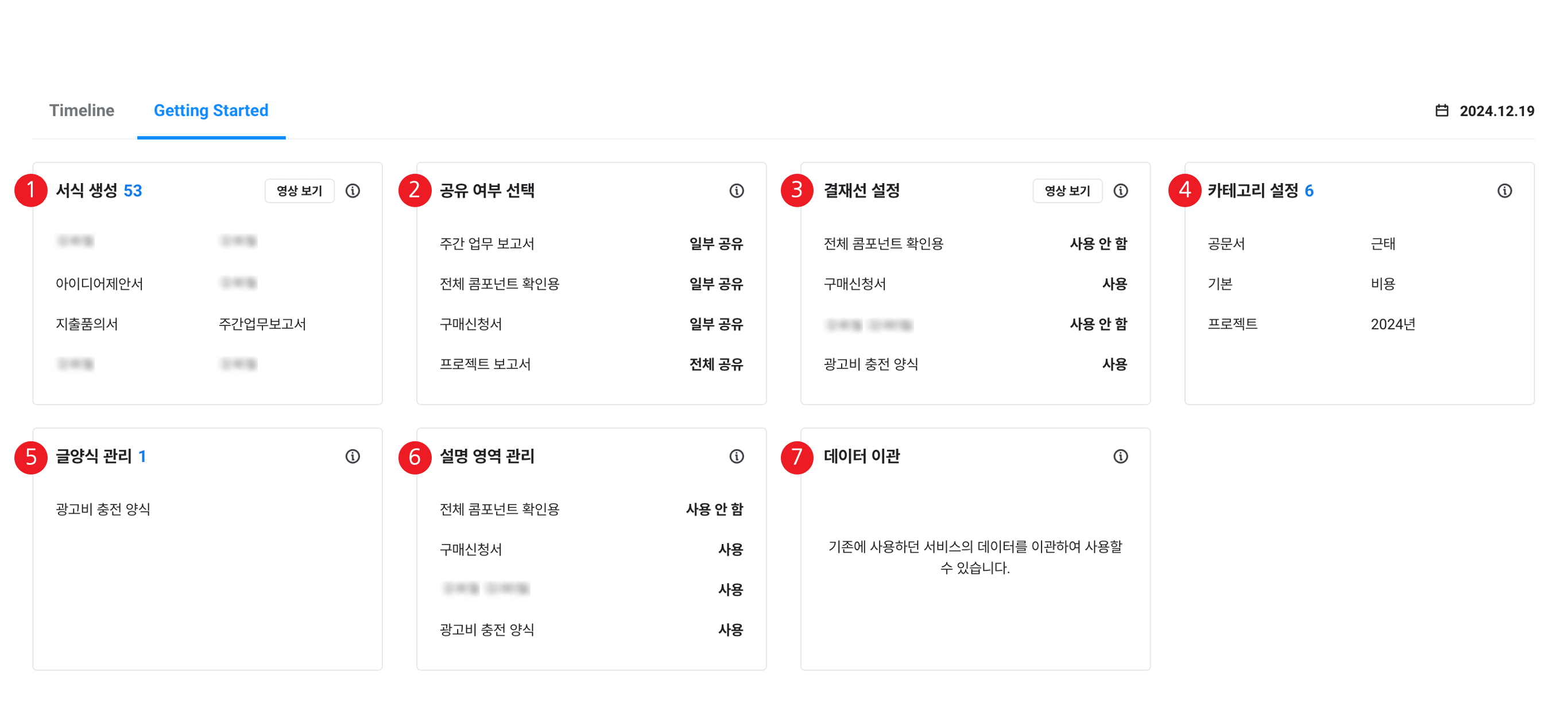 결재 관리에 처음으로 접속하면 결재 관련 정보 설정을 안내하는 Getting Started 화면이 나타납니다. 각 설정 항목은 닫혀진 카드 형태로 표시되며, 카드를 한 번 클릭하면 카드가 열려 기본 반영 사항이 표시되고, 한 번 더 클릭하면 해당 메뉴로 이동합니다.