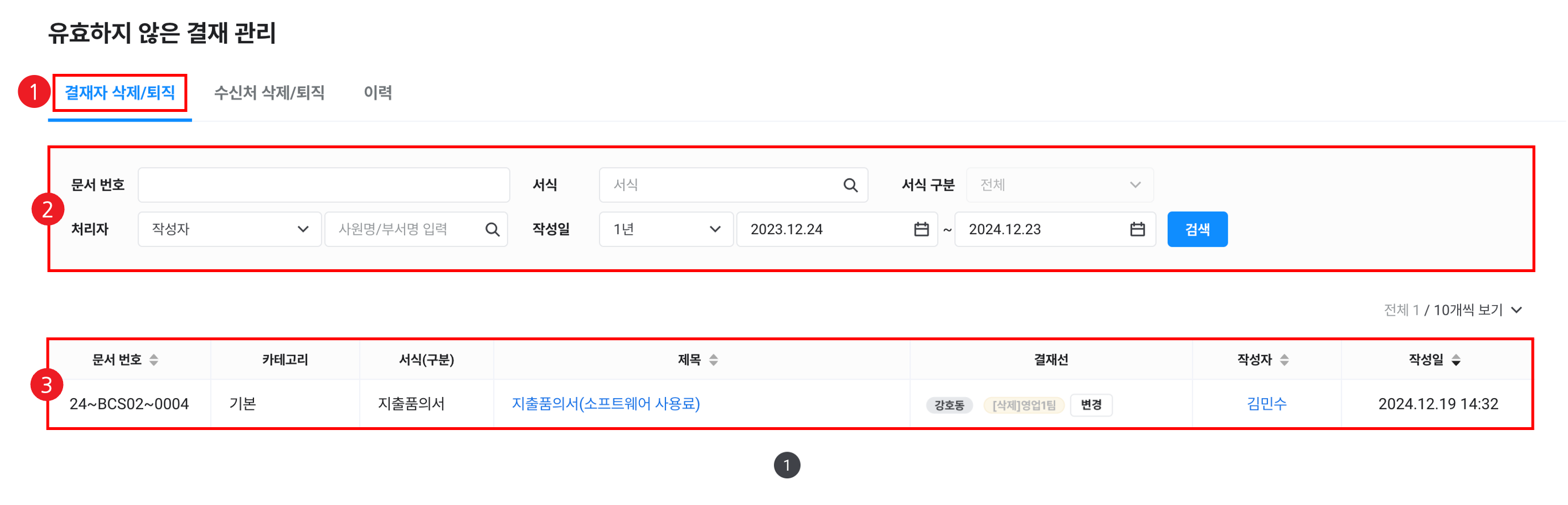 | ① 콘텐츠 탭 | 클릭하여 퇴직(삭제)한 결재자 조회 |